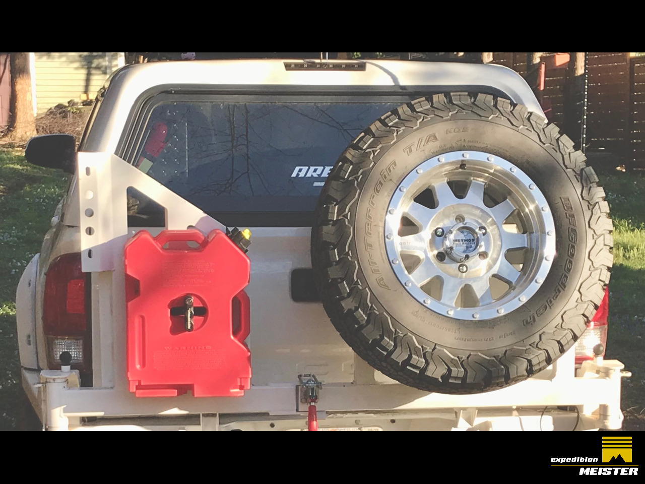 CBI steel rear bumper with split swing outs, angled spare tire carrier and RotoPax adapter for 2 - 2 gallon tanks.