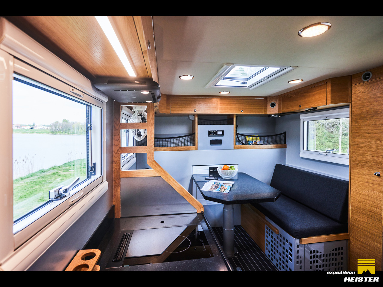 Materialnetze, Bücherregale, Schubladen mit Sperren zum Schutz vor Öffnen während der Fahrt