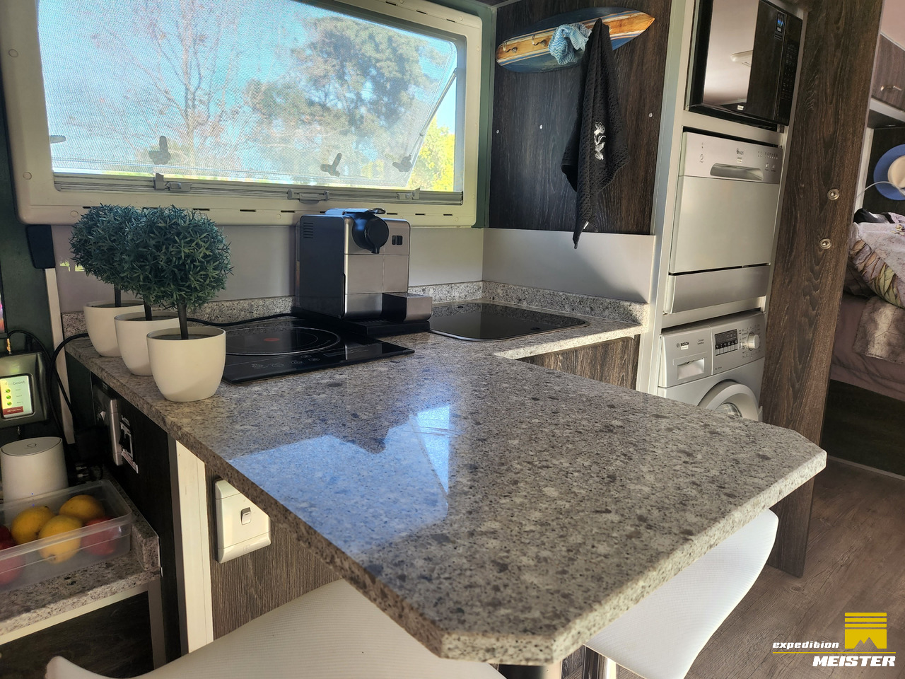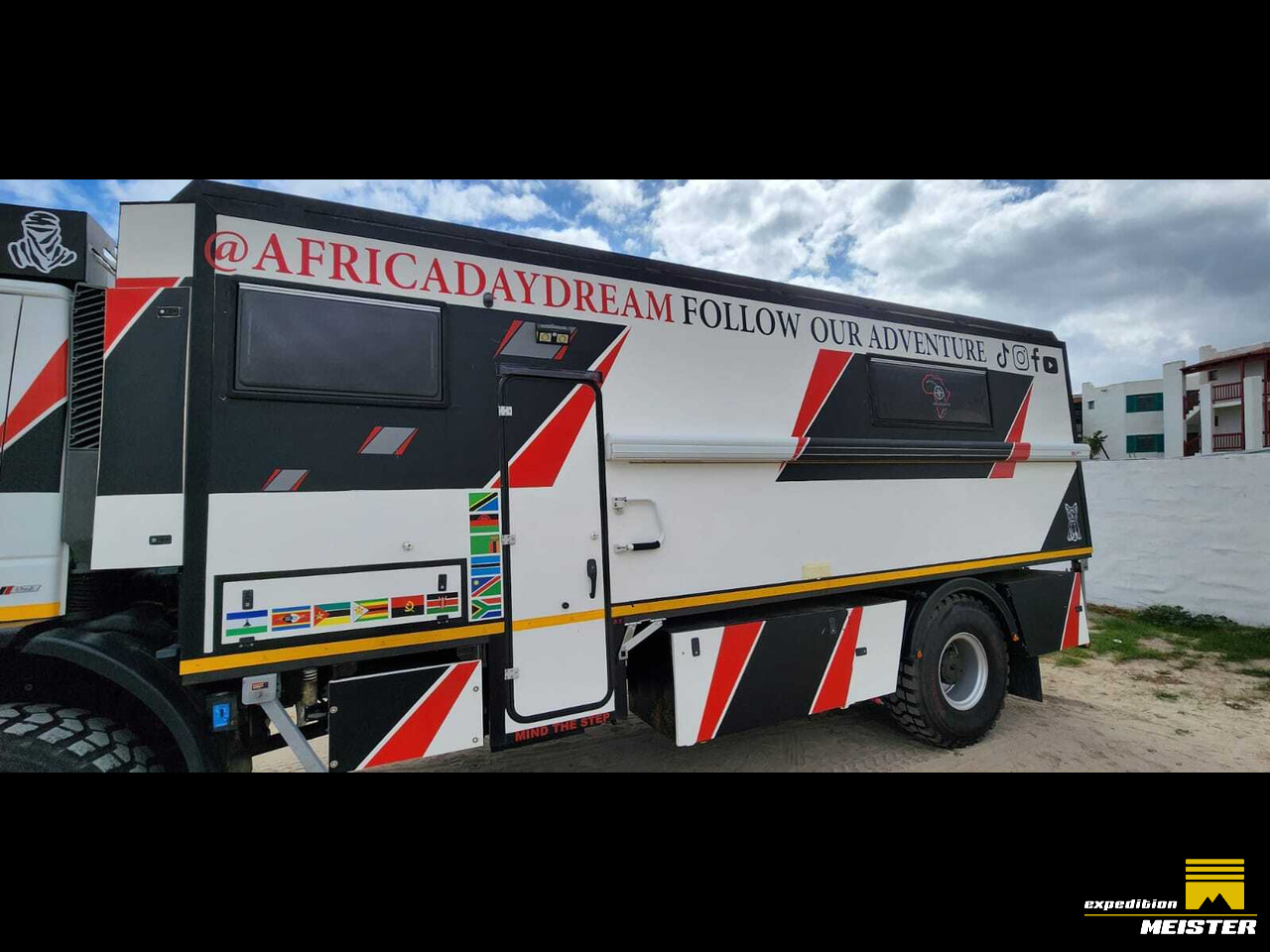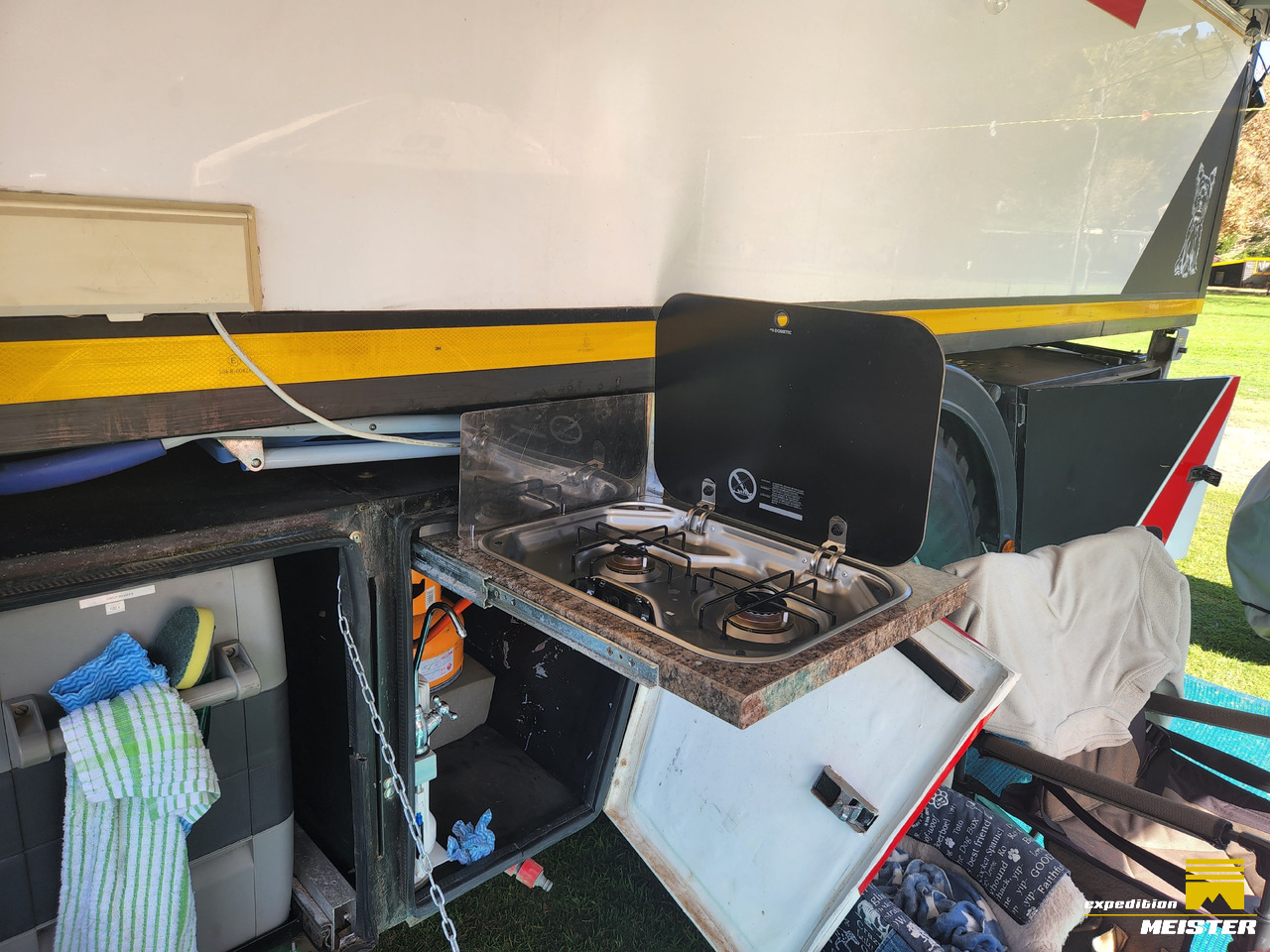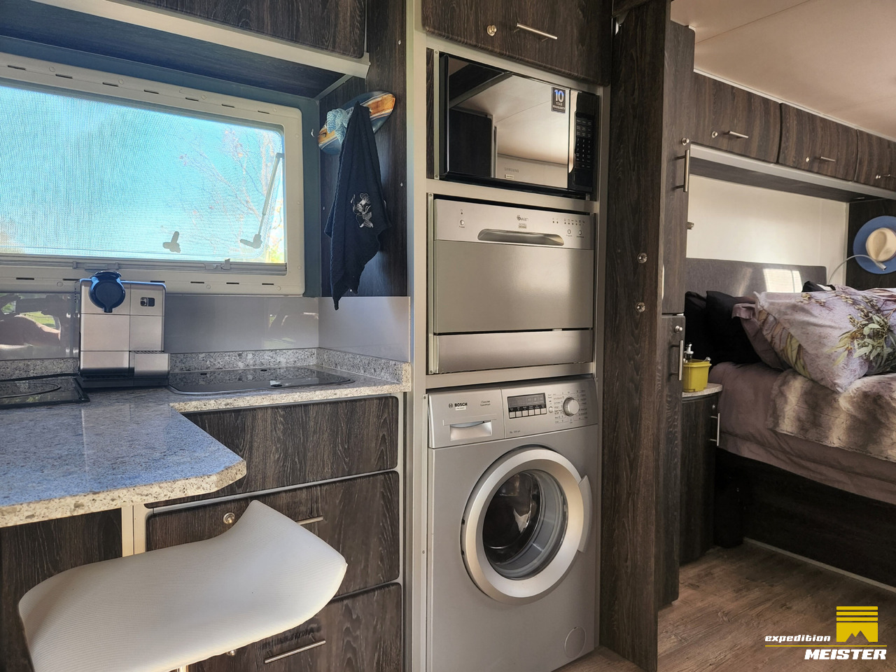 Fiamma F45l awning, outside bar, outside Kitchen includes cutlery draw, Snappy Chef induction stove, wash basin, Waeco camp Fridge/Freezer, Triple Filter water purification unit with tap for drinking water, Bushtec Ice Maker. Outside Shower, Six outside storage units, rear mounted Lift ( can accommodate a large Motorcycle)