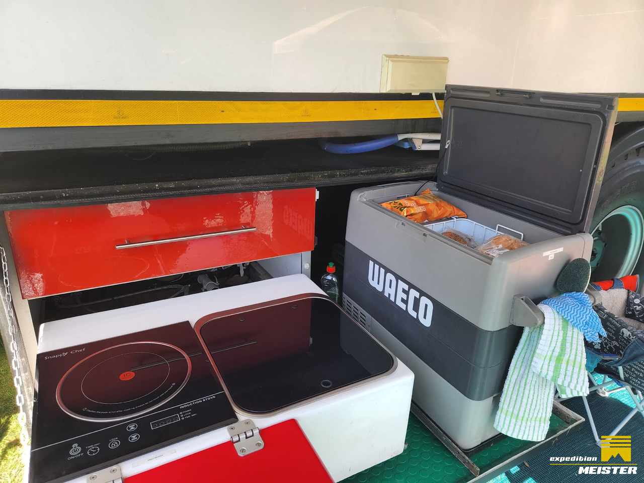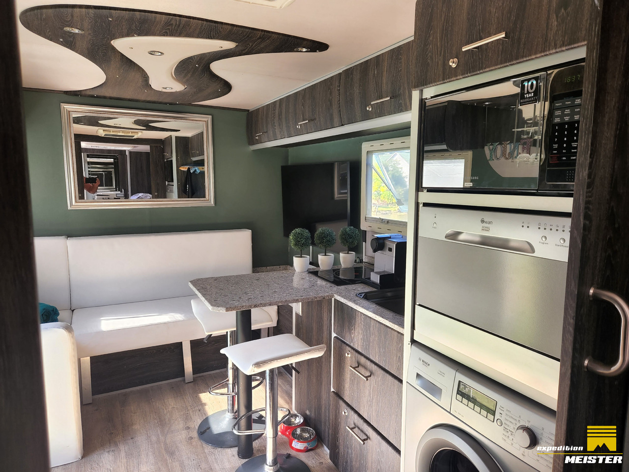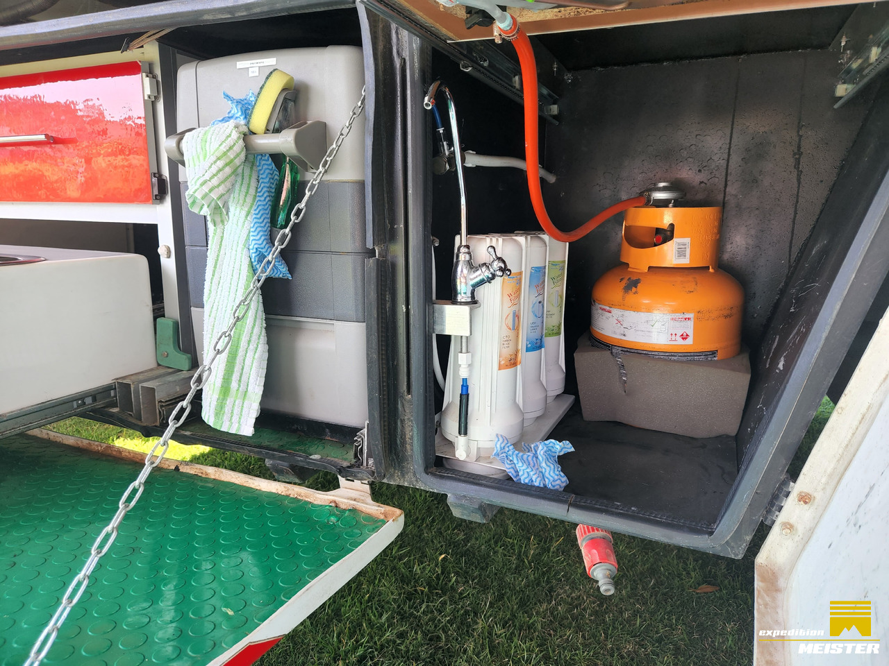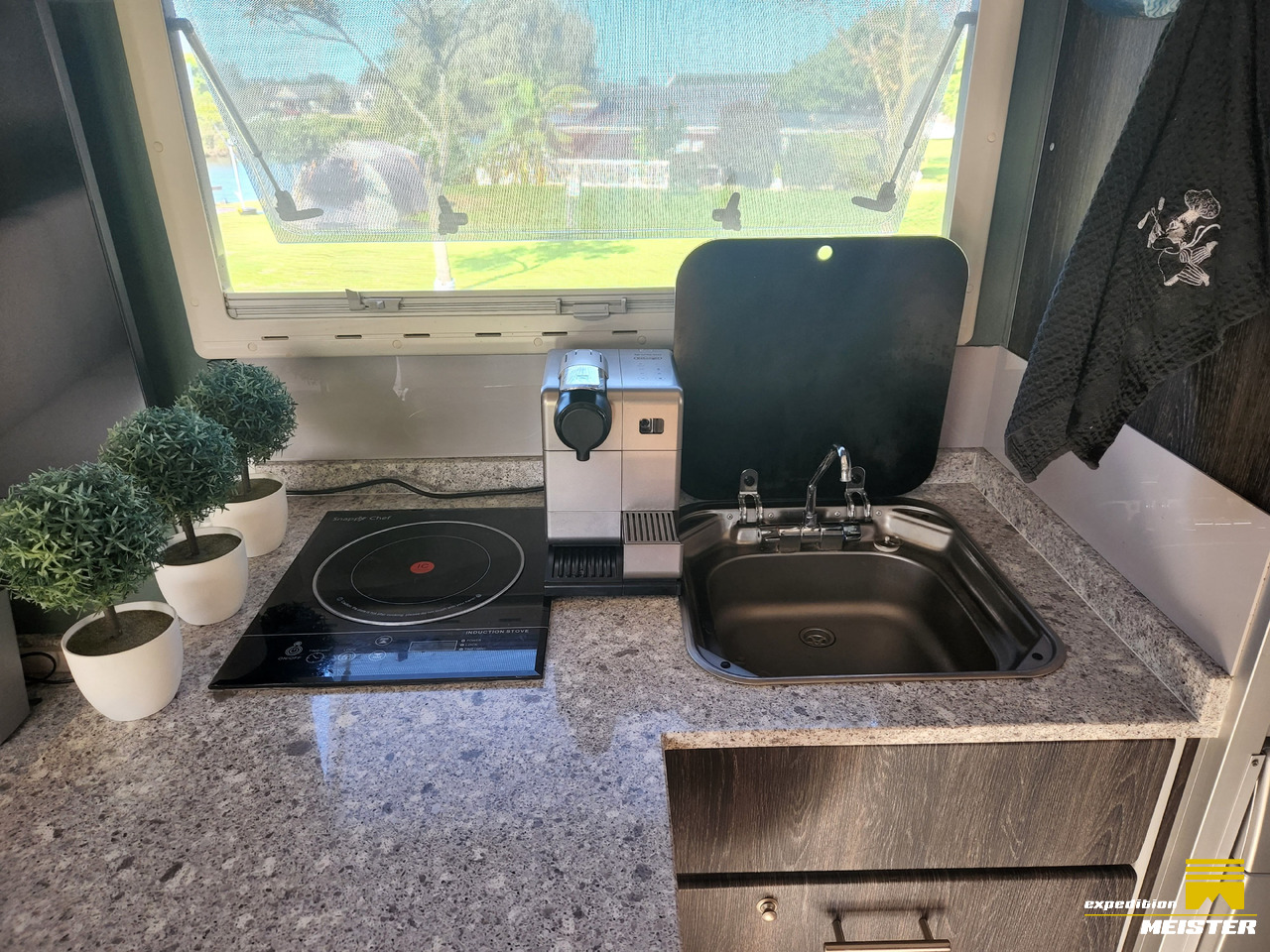 Fiamma F45l awning, outside bar, outside Kitchen includes cutlery draw, Snappy Chef induction stove, wash basin, Waeco camp Fridge/Freezer, Triple Filter water purification unit with tap for drinking water, Bushtec Ice Maker. Outside Shower, Six outside storage units, rear mounted Lift ( can accommodate a large Motorcycle)