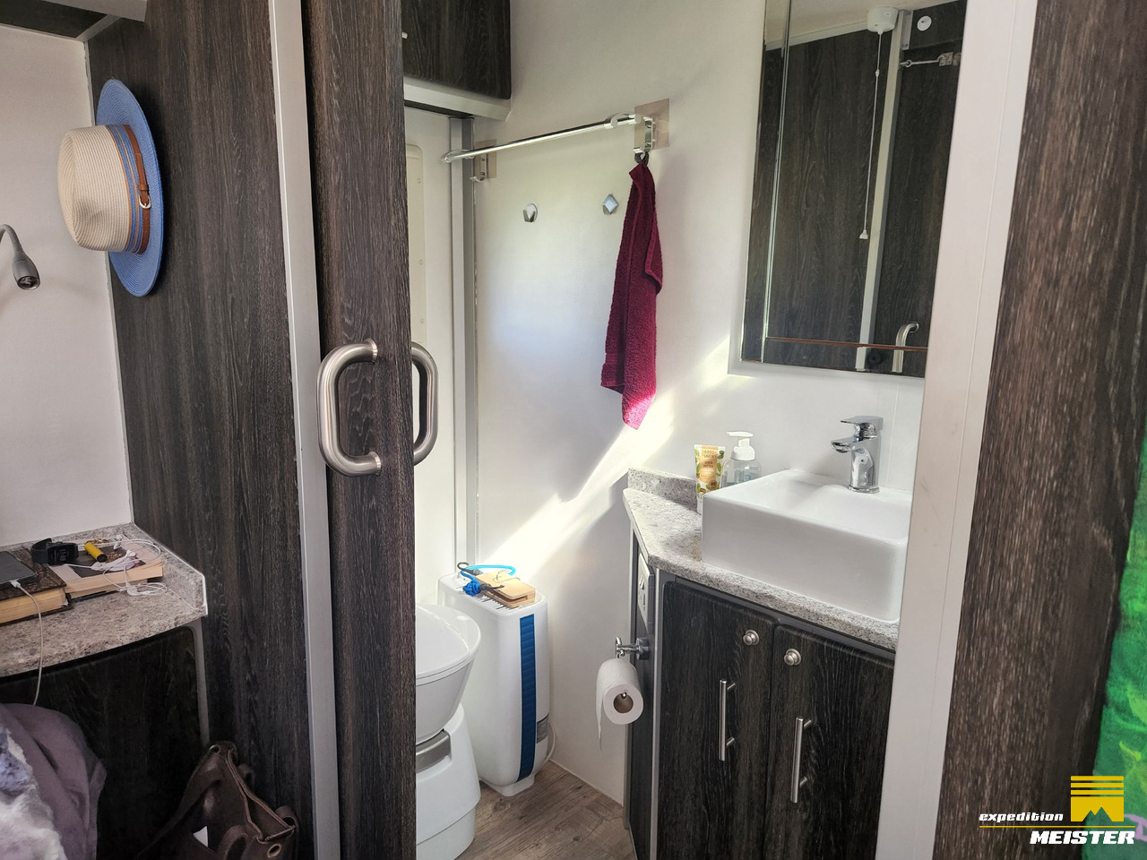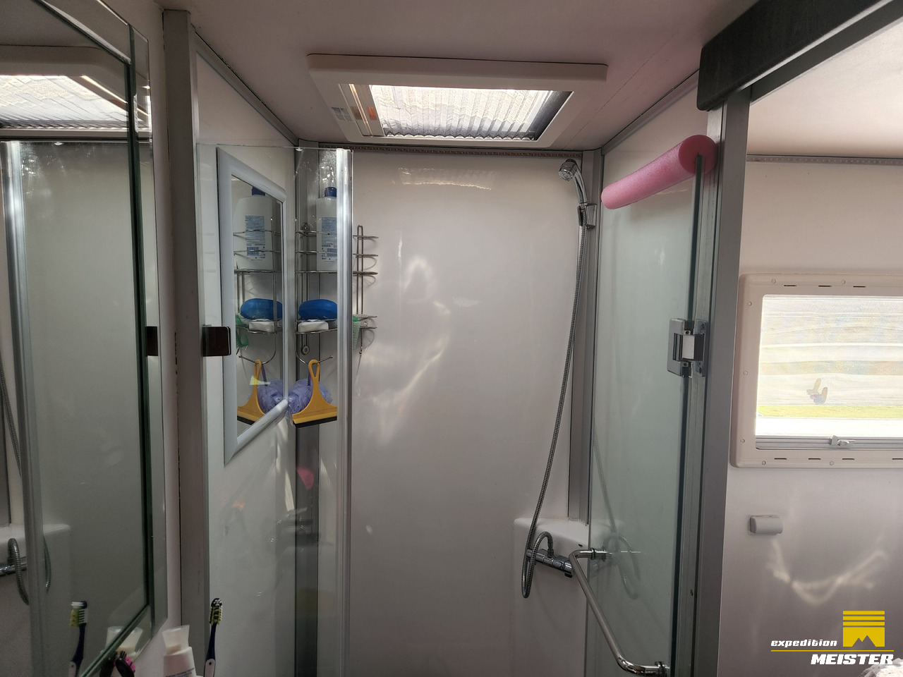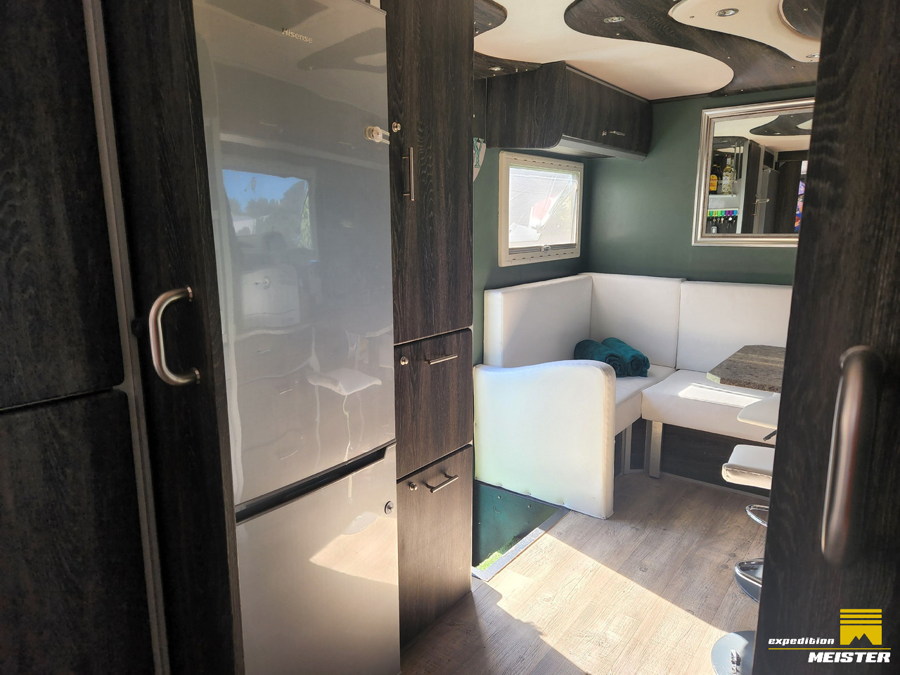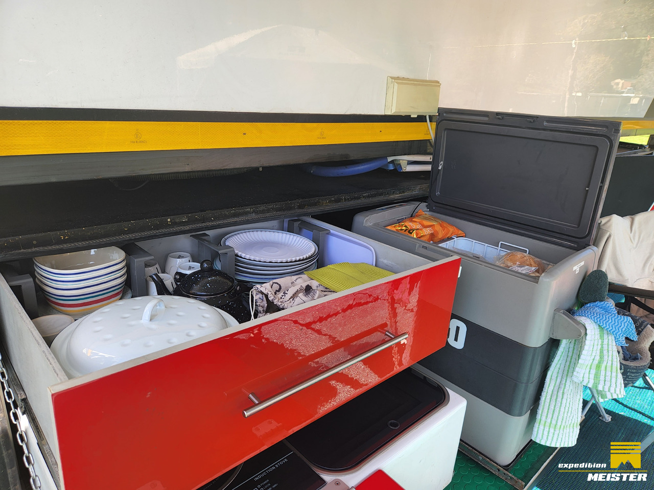 Fiamma F45l awning, outside bar, outside Kitchen includes cutlery draw, Snappy Chef induction stove, wash basin, Waeco camp Fridge/Freezer, Triple Filter water purification unit with tap for drinking water, Bushtec Ice Maker. Outside Shower, Six outside storage units, rear mounted Lift ( can accommodate a large Motorcycle)
