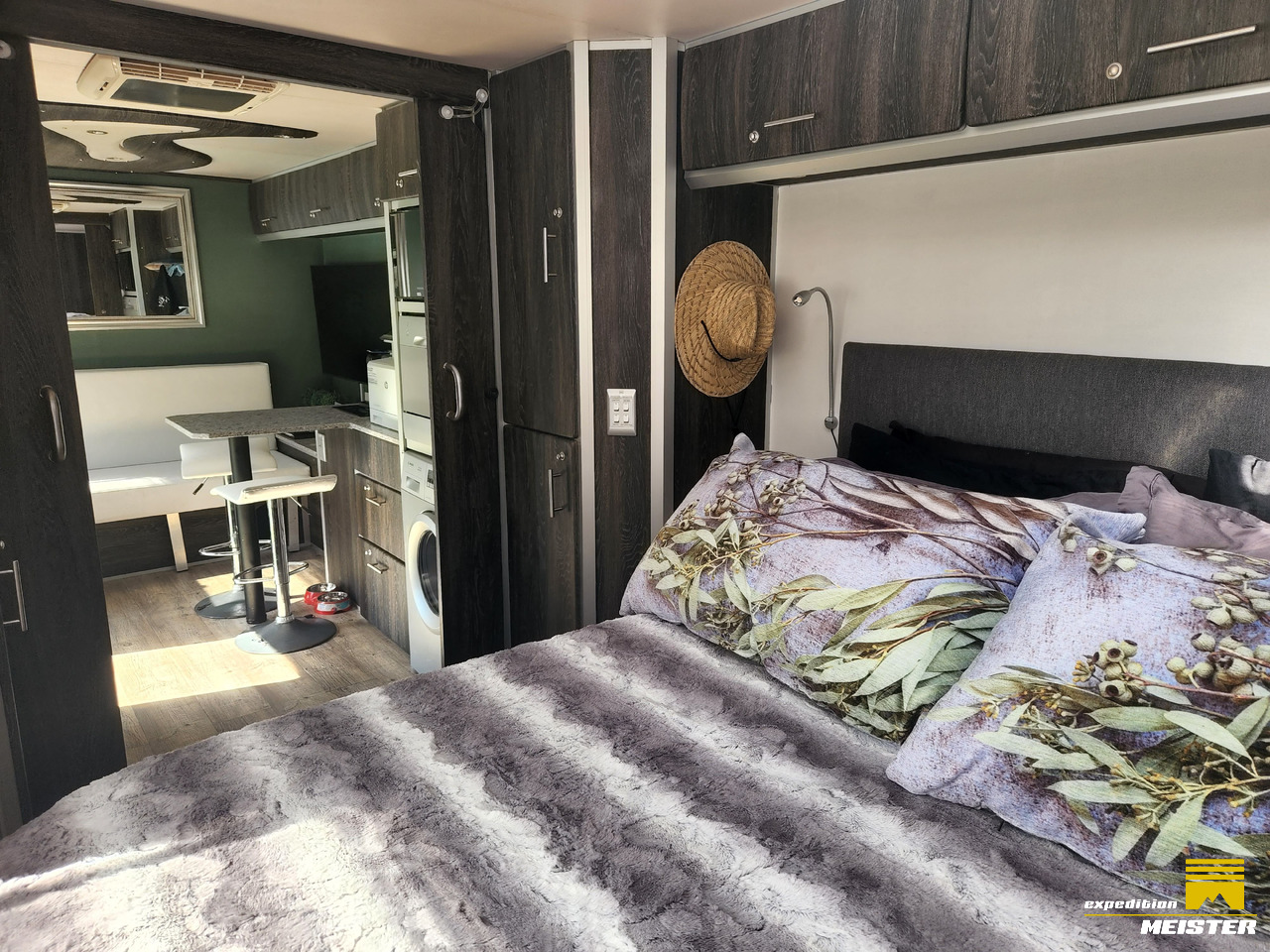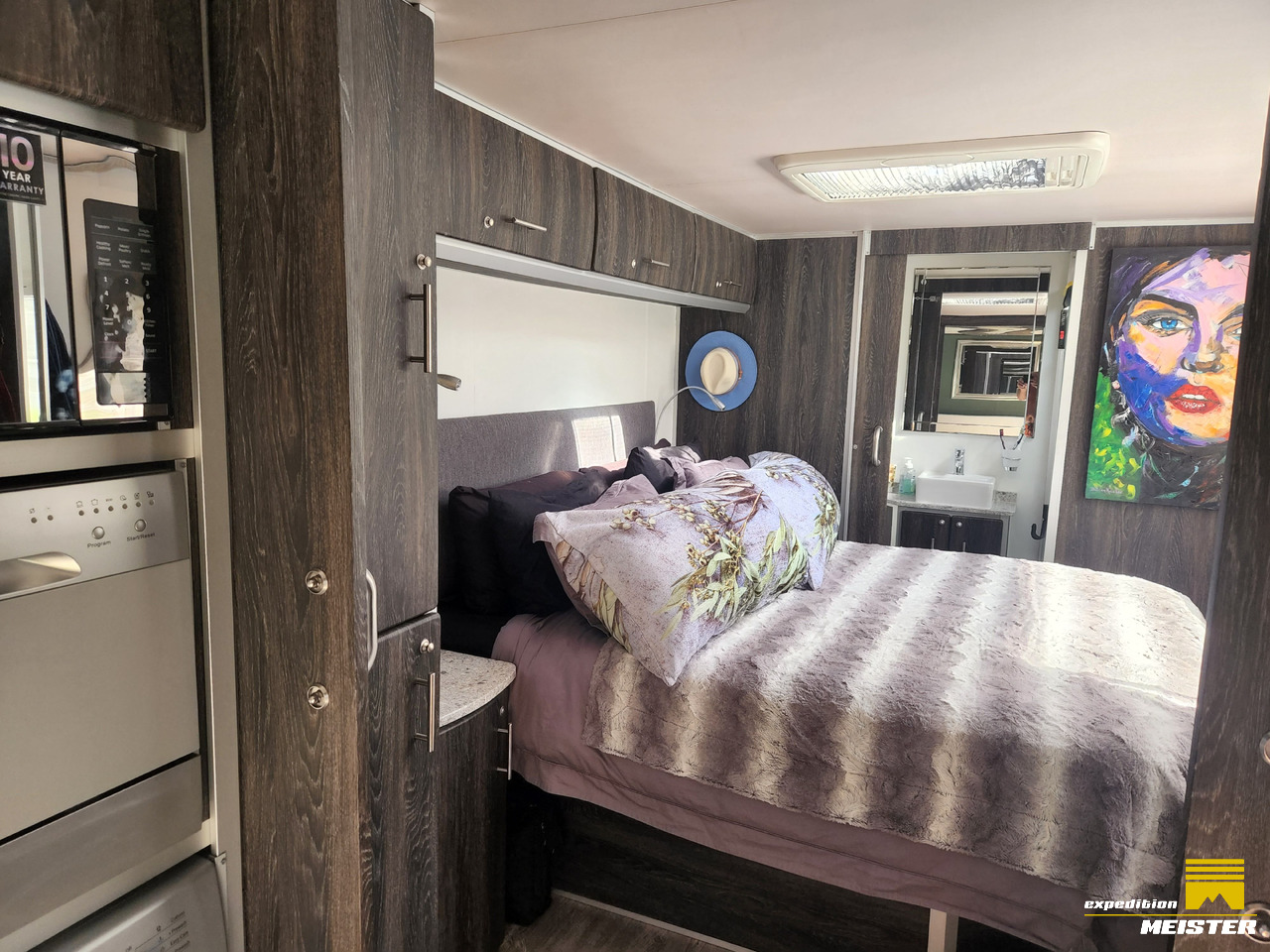 Main Bedroom - Island Queen Size bed, with headboard & bedside tables, His & Hers clothing Cupboards with additional packing space above bed. Privacy Door between living area and Bedroom. En-suit bathroom with sliding door, shower, Cupbard basin, Domestic Toilet and Dehumidifier.