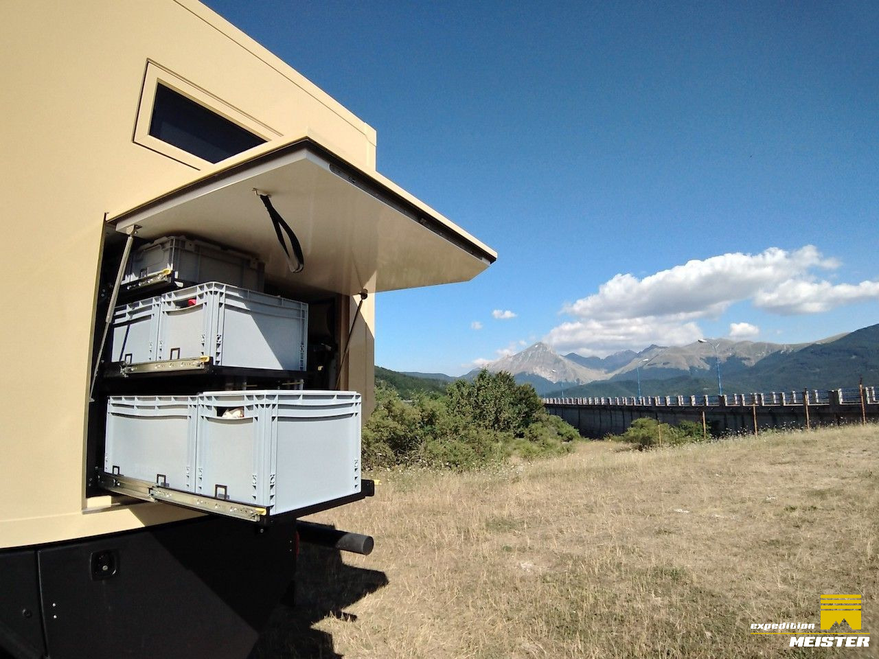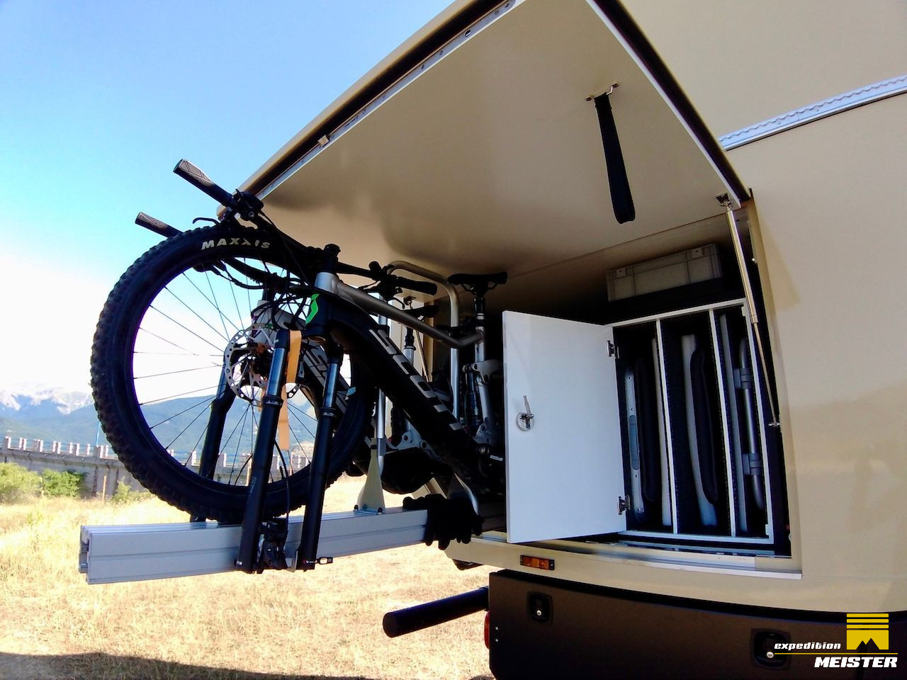 Large garage, slide-out e-bike rack, table and chair cabinet, Eurobox pull-out on heavy duty slide outs. Keder and airline rail combination for sun sails (2 Sunsail included), 4 outside Storage boxes.