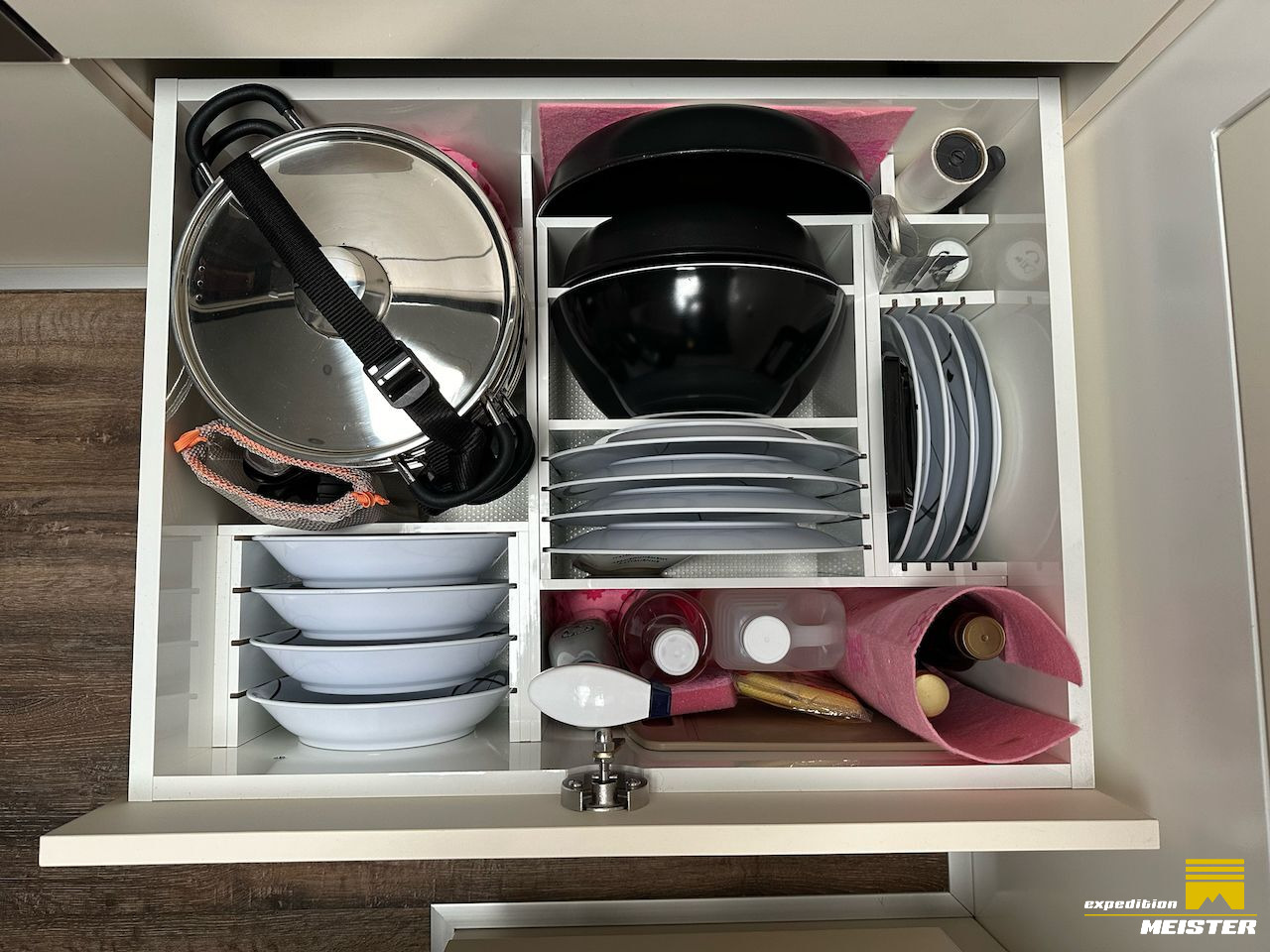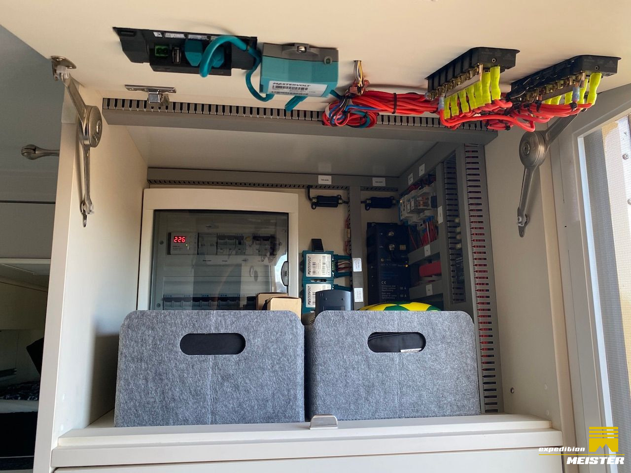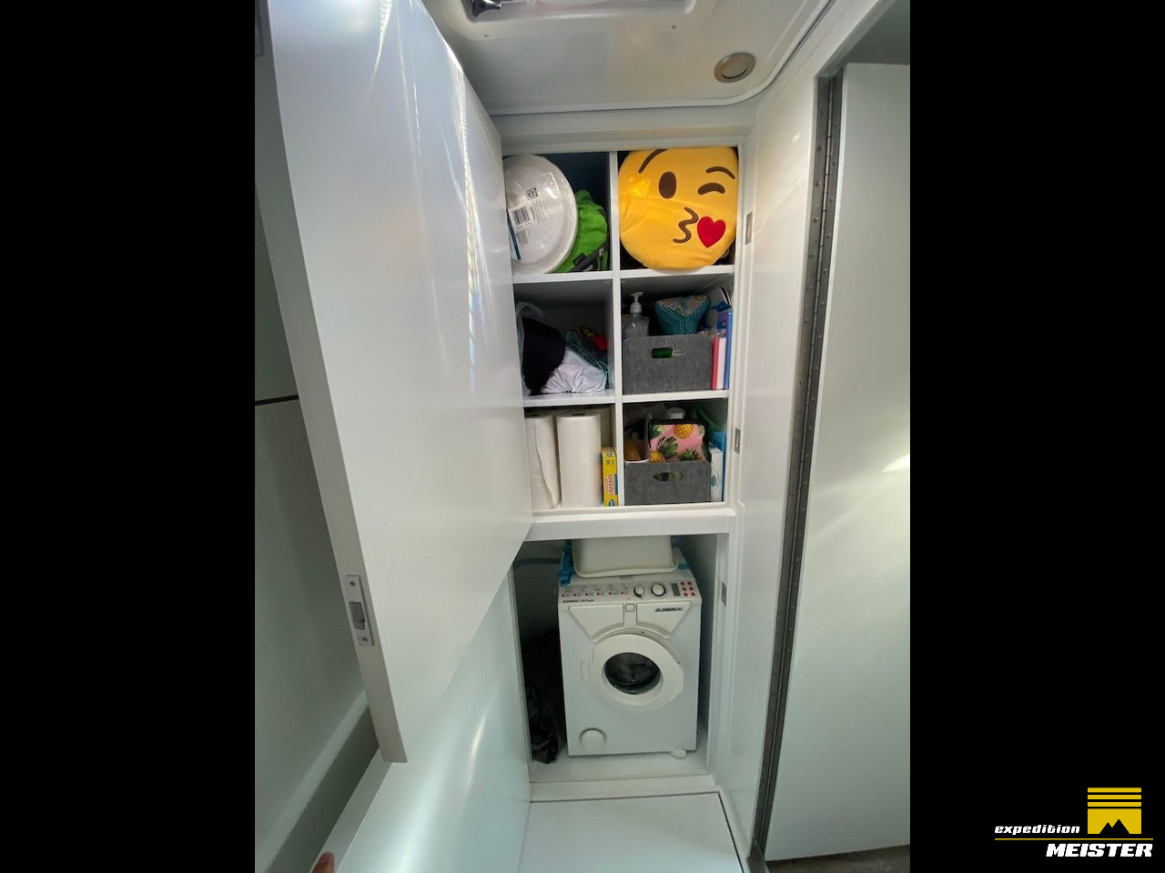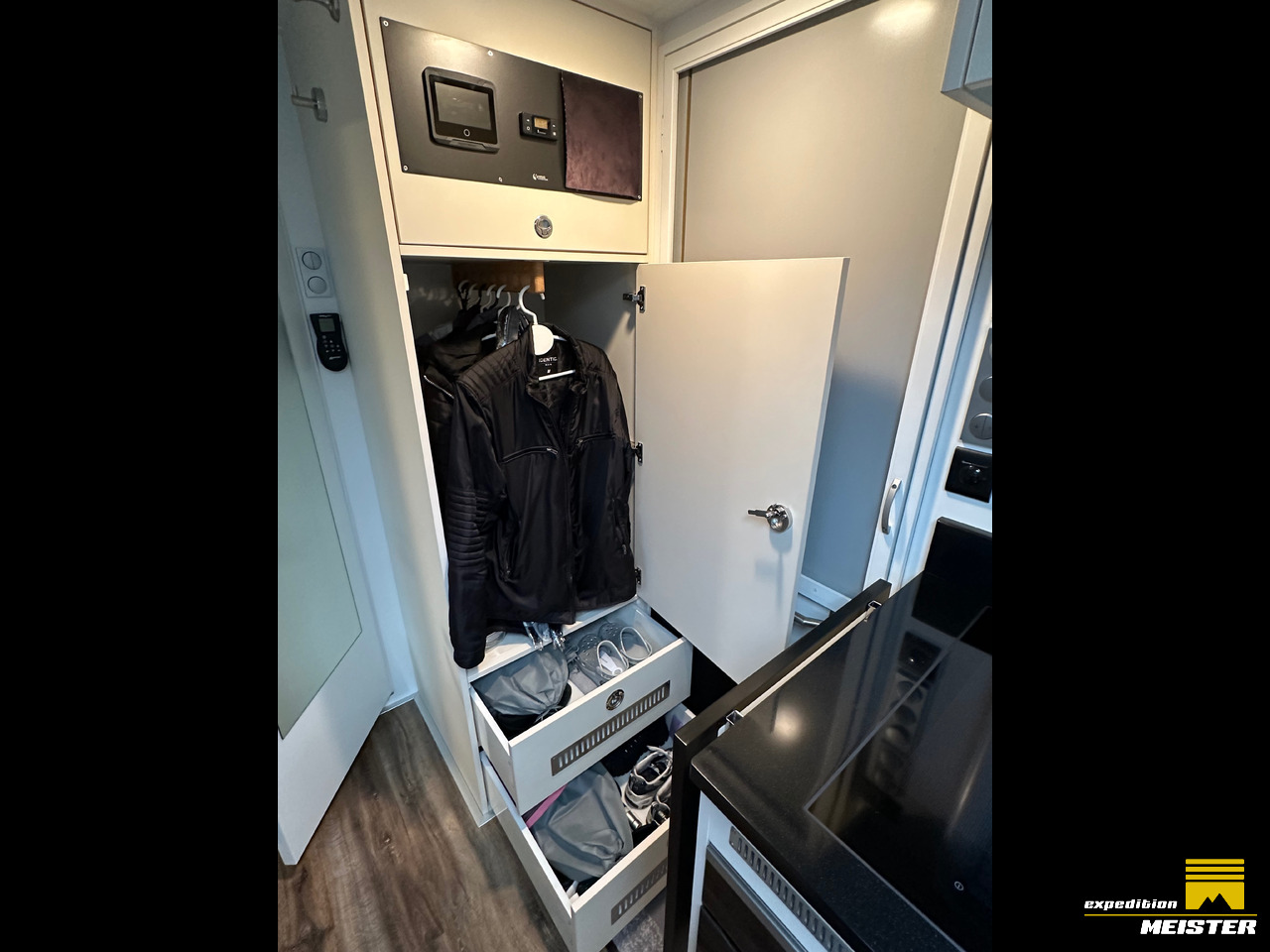 Lots of storage space in the driver's cab, heavy-duty pull-outs with Euro boxes, separate storage space in driver Cab for 2 large suitcases (we use them as a winter clothes closet), all covered with Alcantara.