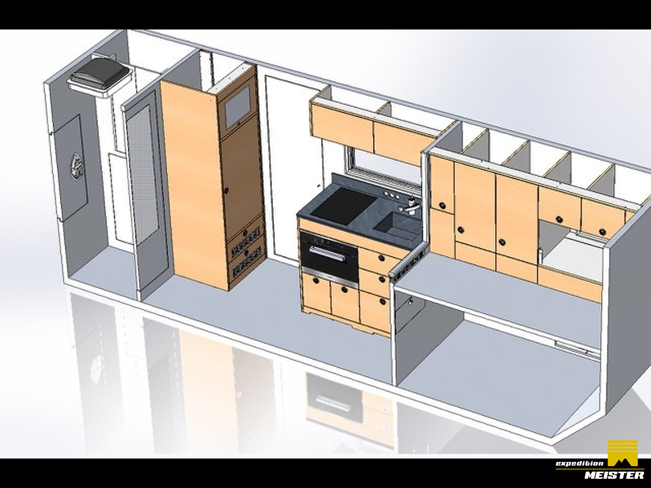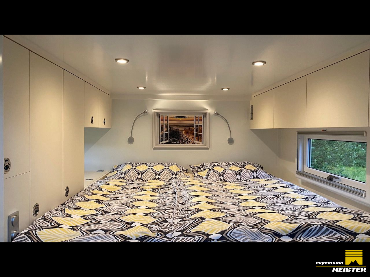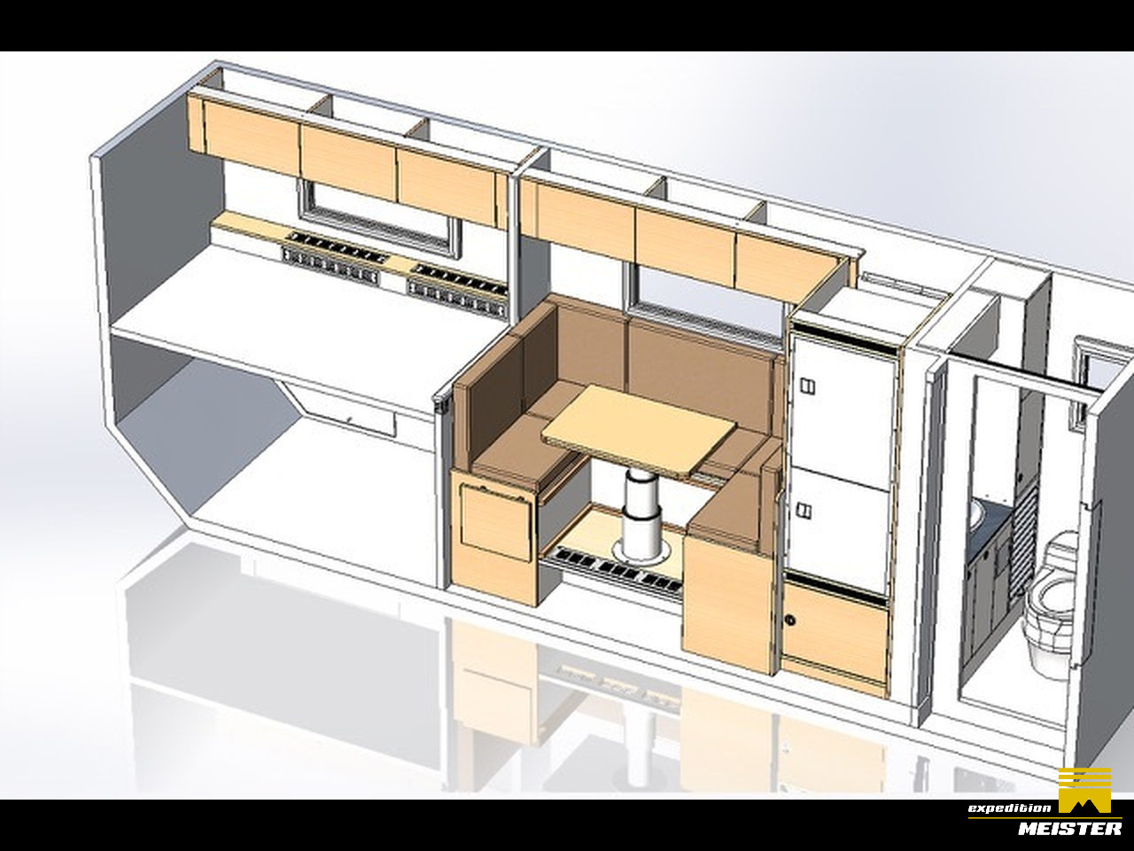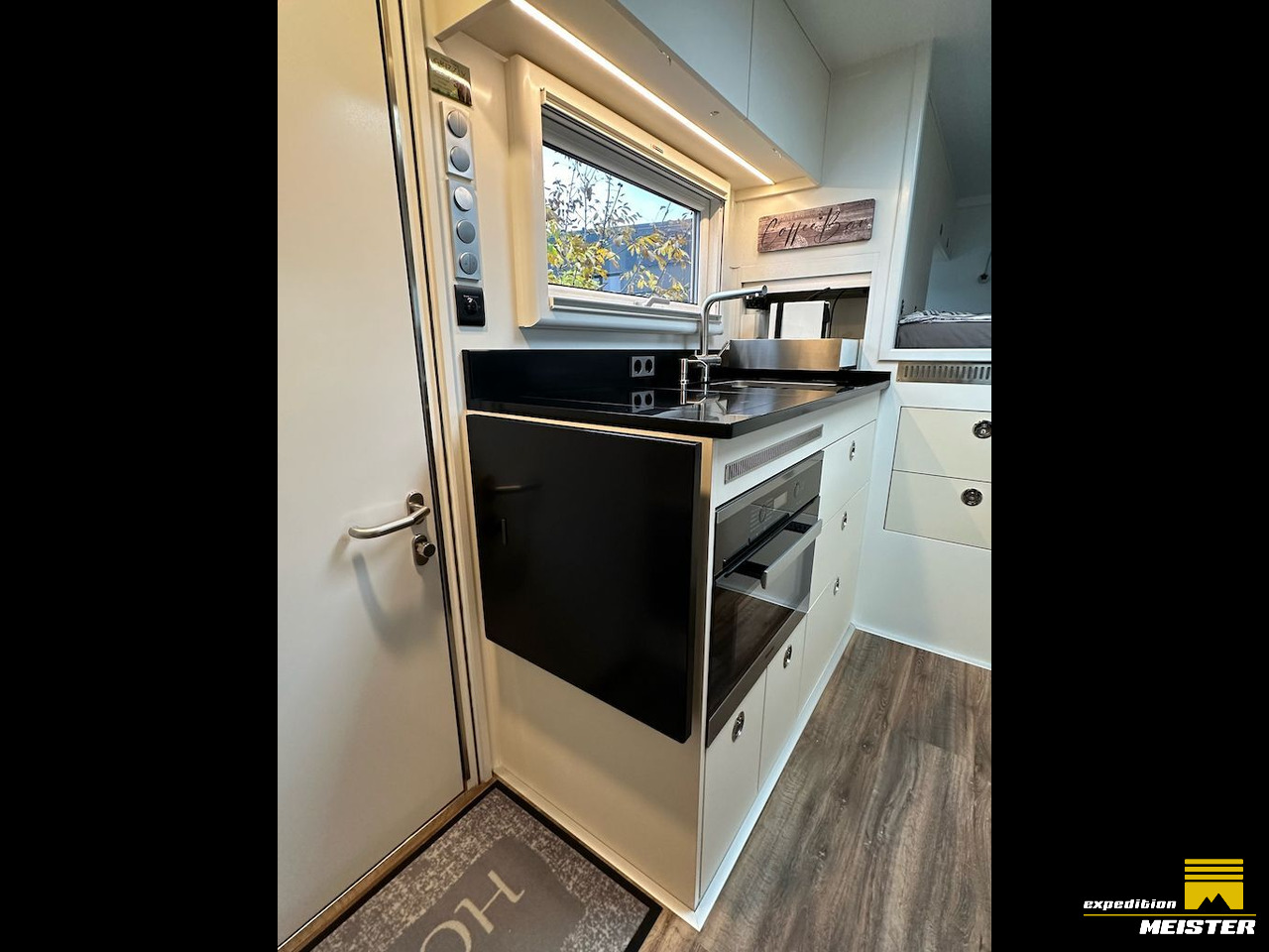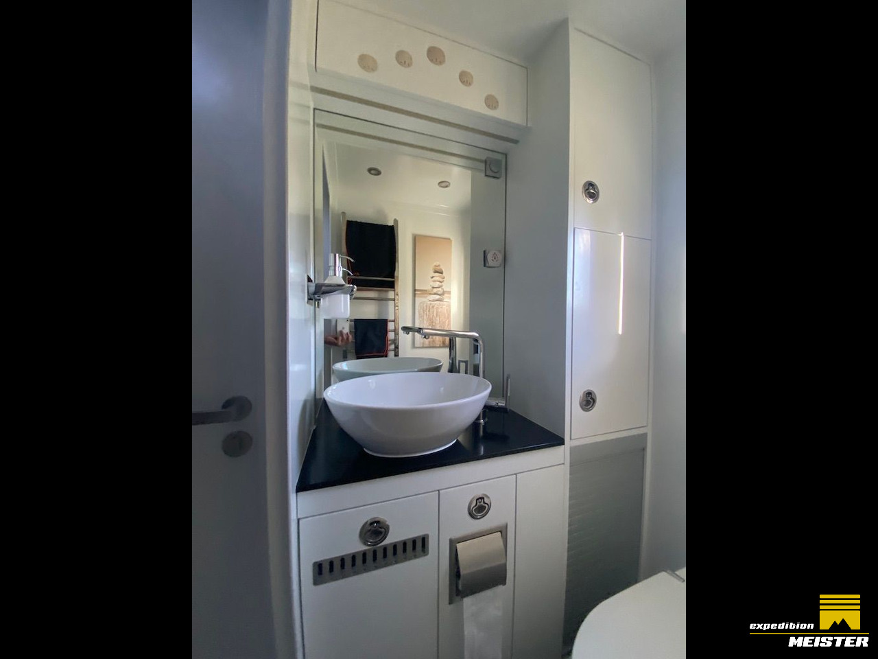 Lots of storage space in the driver's cab, heavy-duty pull-outs with Euro boxes, separate storage space in driver Cab for 2 large suitcases (we use them as a winter clothes closet), all covered with Alcantara.