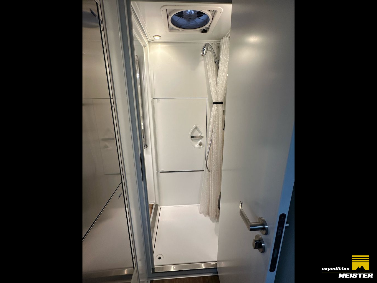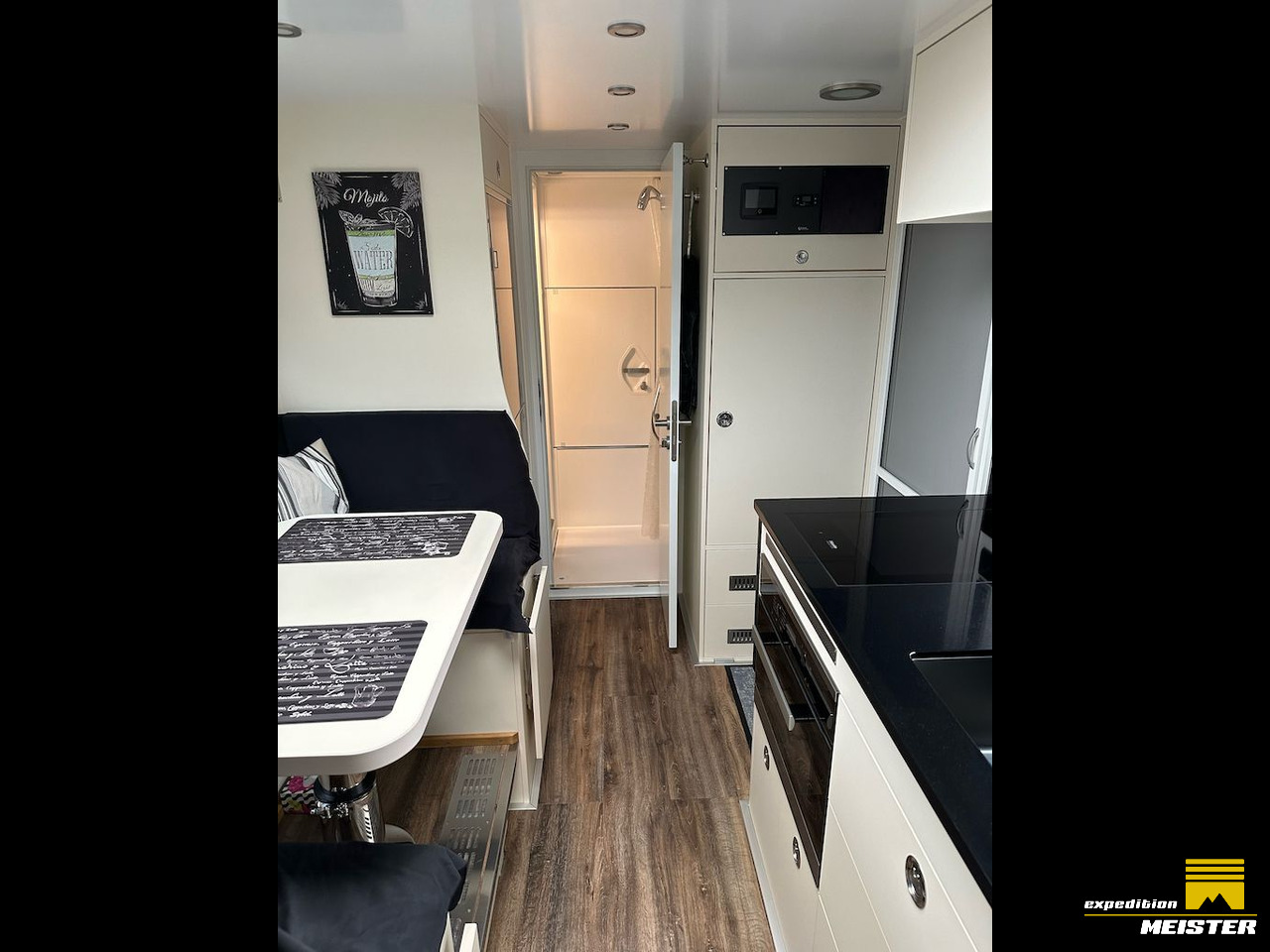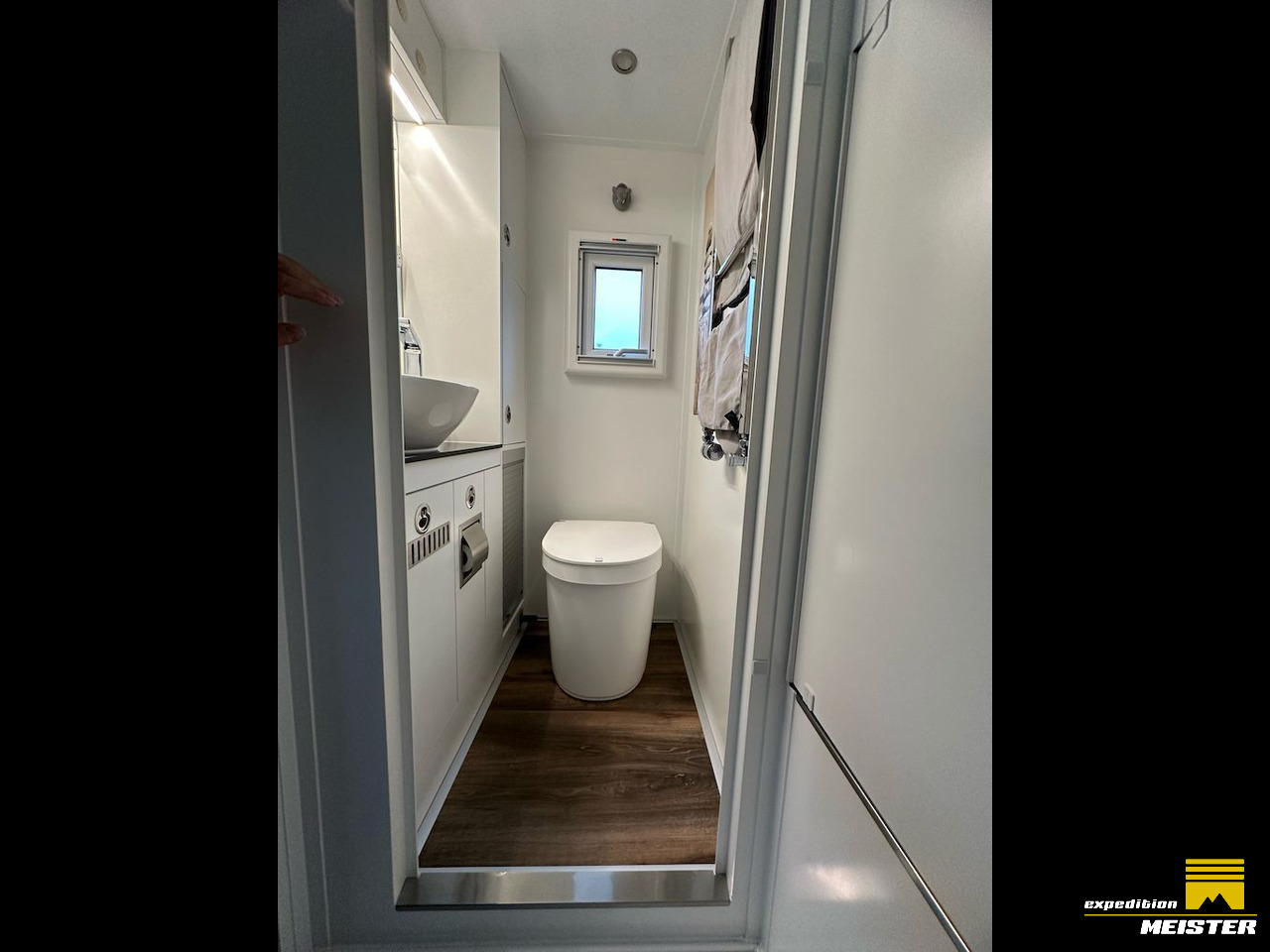 Truck is gas-free and complete 24V, 700L freshwater (400+300L) frost-secured inside, 235L gray water tank heated through Eberspächer or Heatexchanger, Separett Tiny Composte toilet with a 55L urine tank inside, both waste tanks can be emptied electrically from the driver's cab.