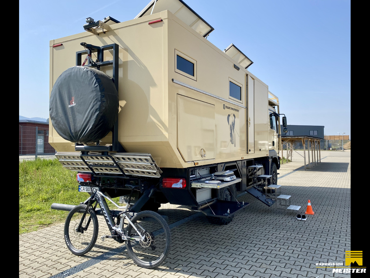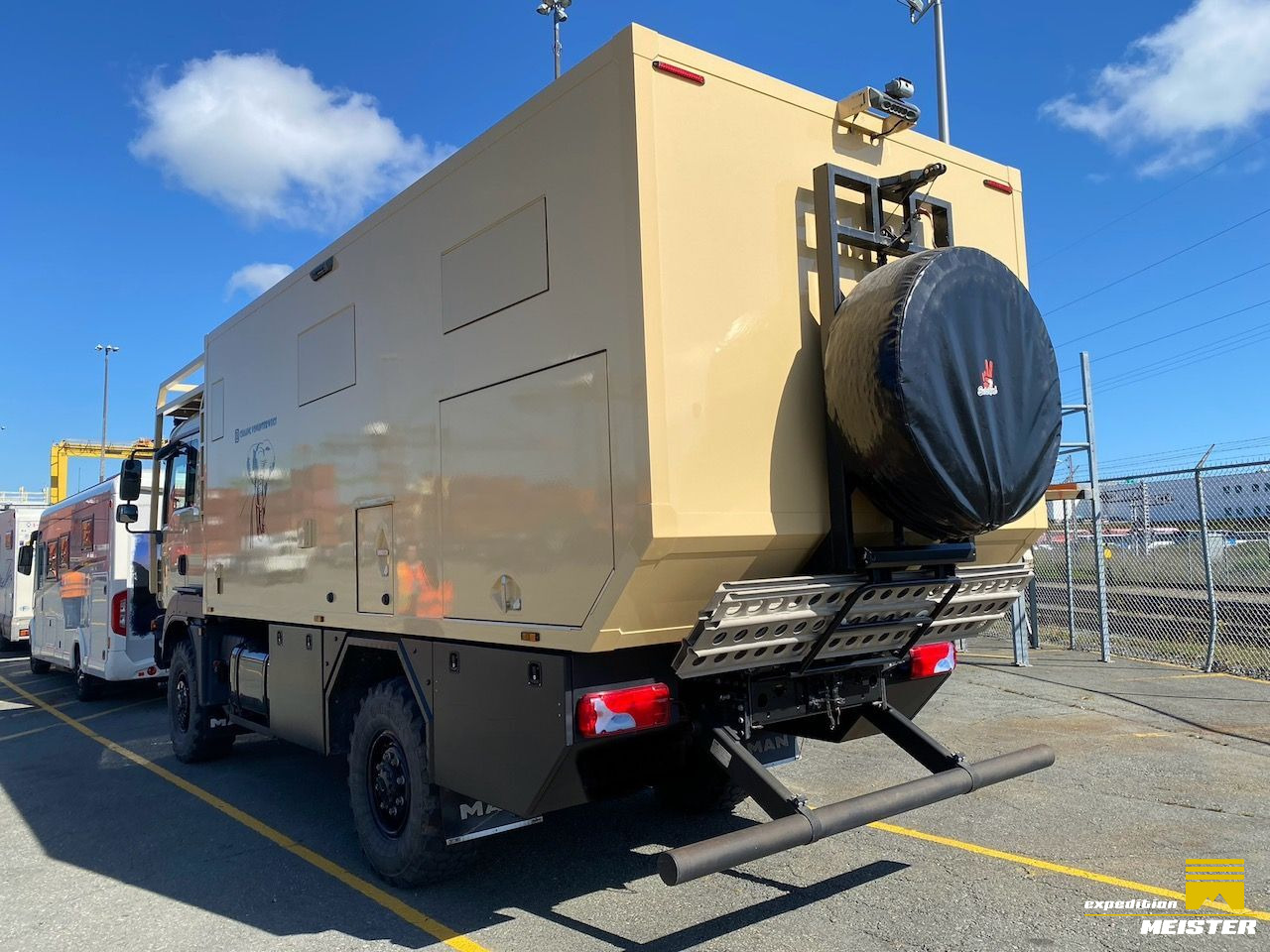 Spare wheel with electric winch on carrier, heavy duty sand ladder.