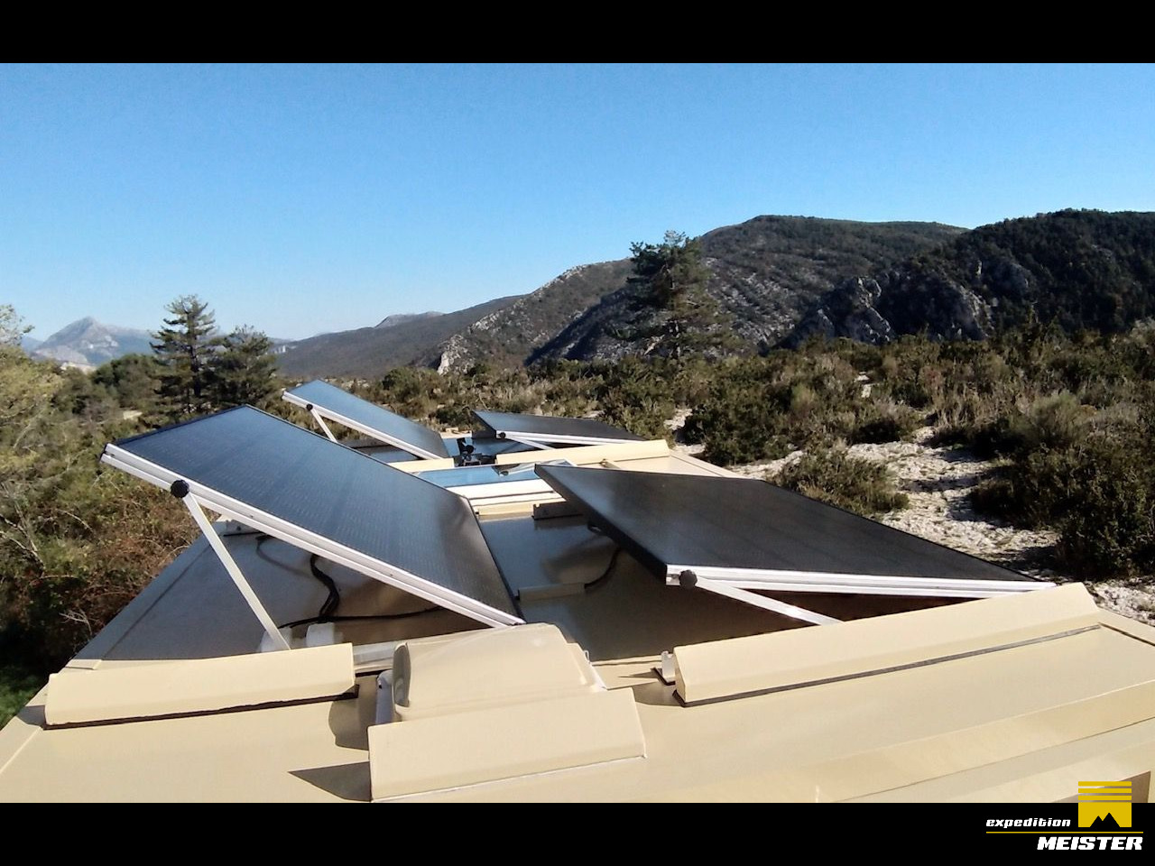 4 photovoltaic panels 1280w, they are titable, in winter time when the sun is low, the batteries get more power.