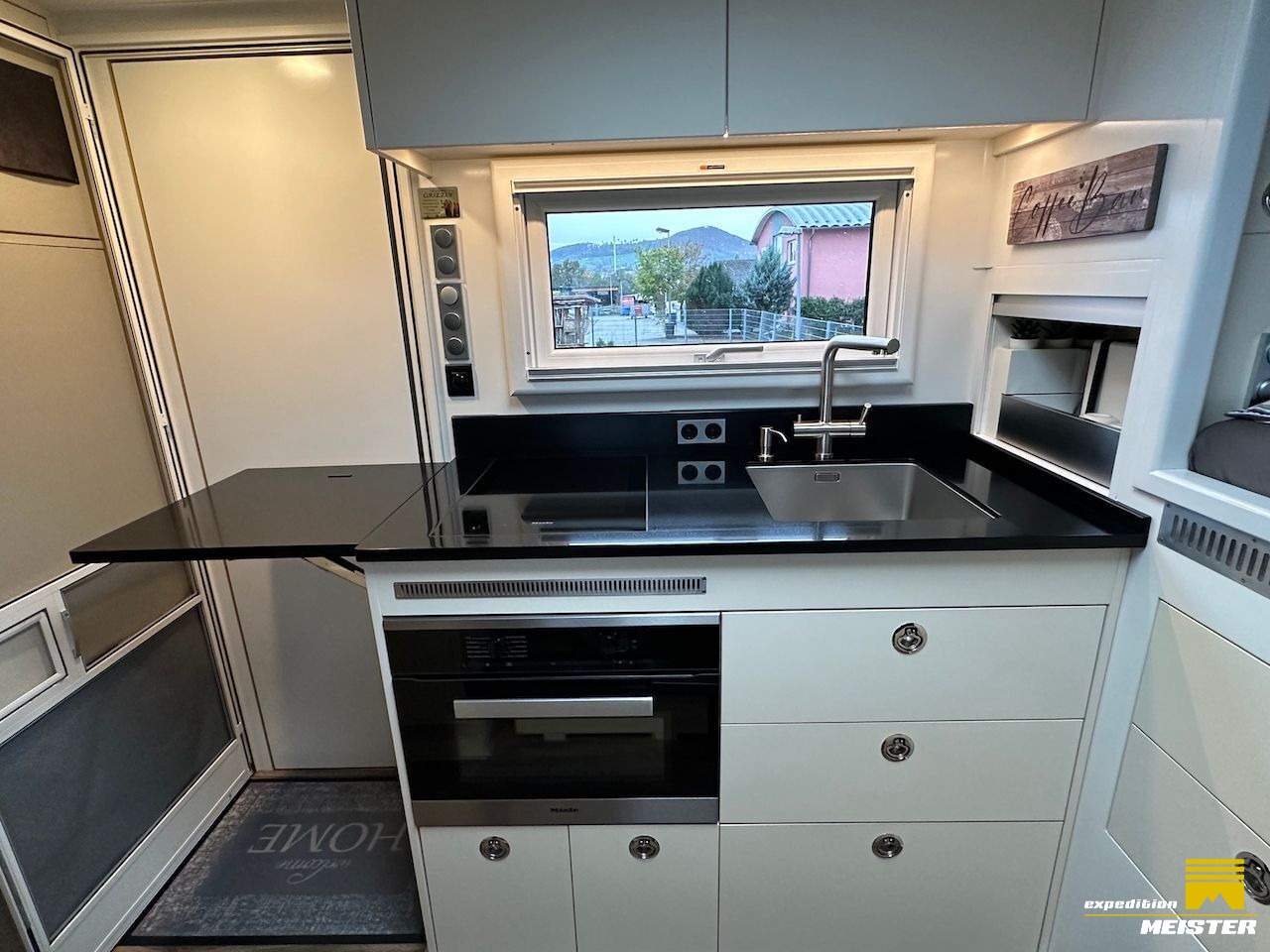 3KG Washing machine inside, individual outdoor kitchen with De Longhi contact grill & induction hob, separate shower 80x80 with a Maxxfan above that has rain/temperature sensor.