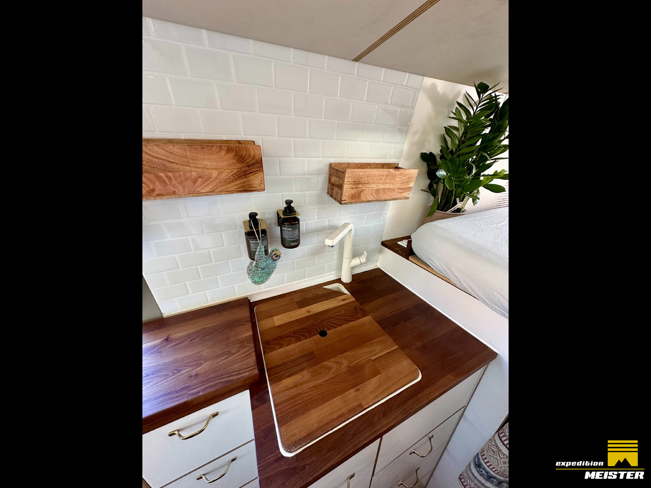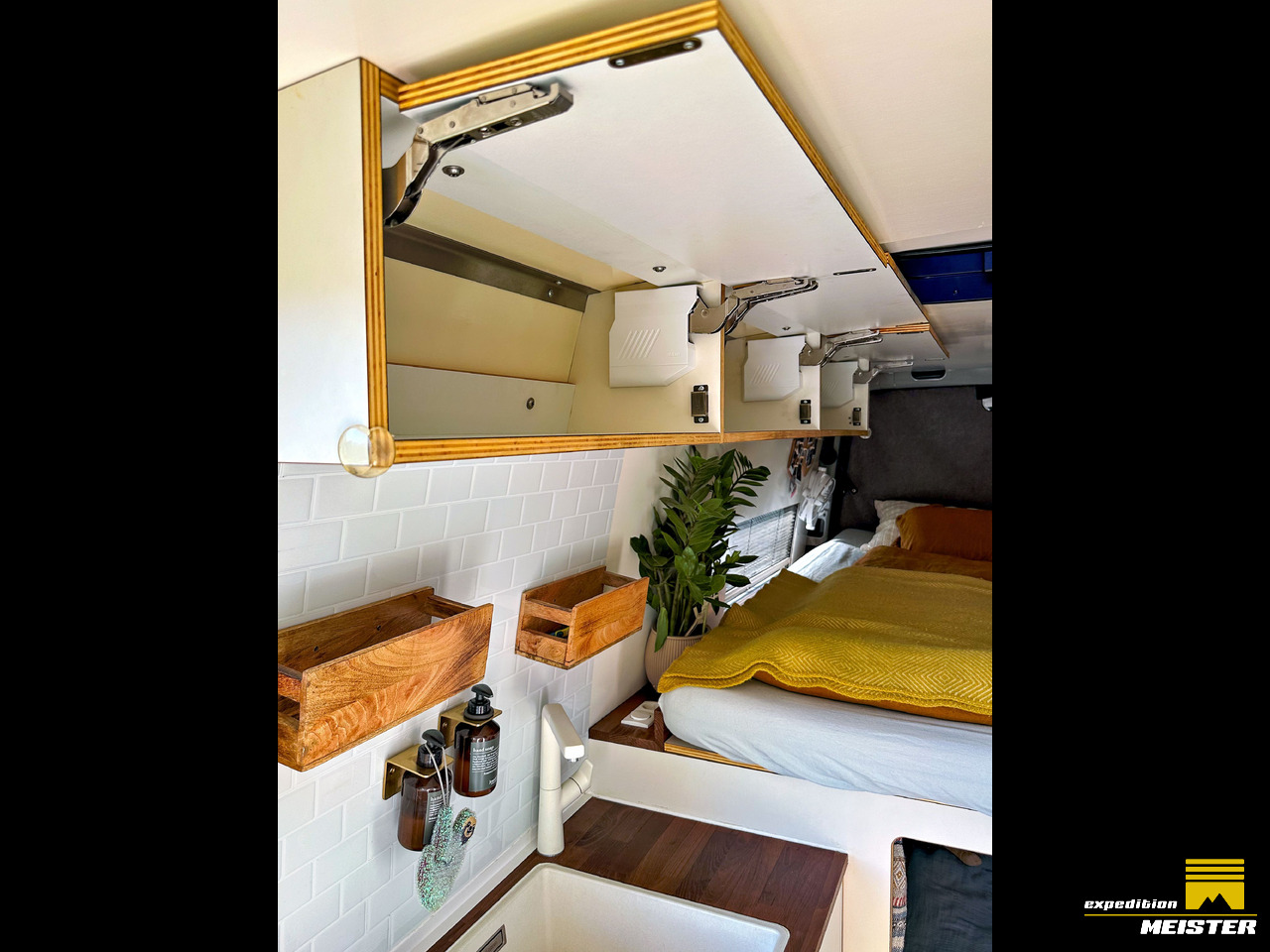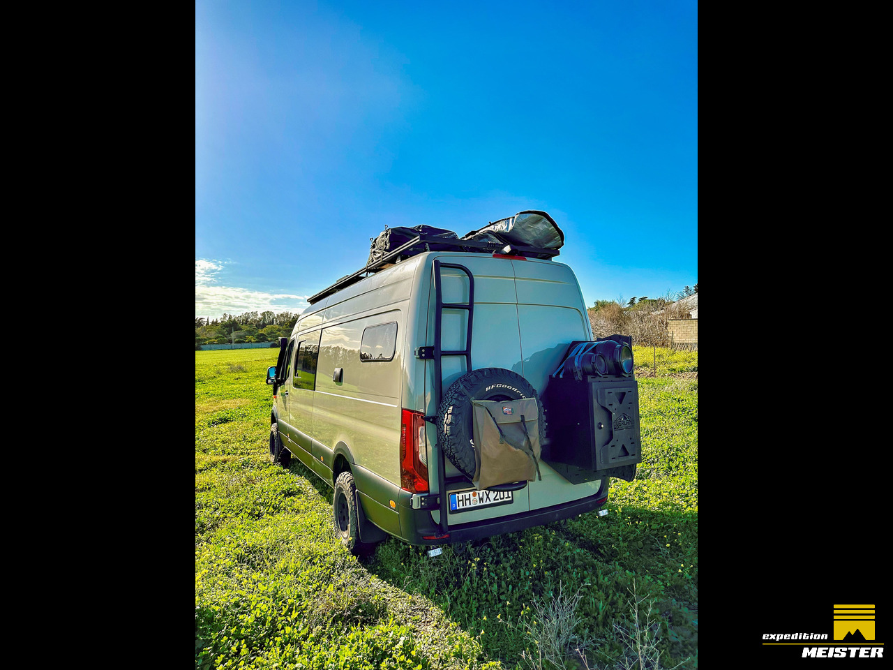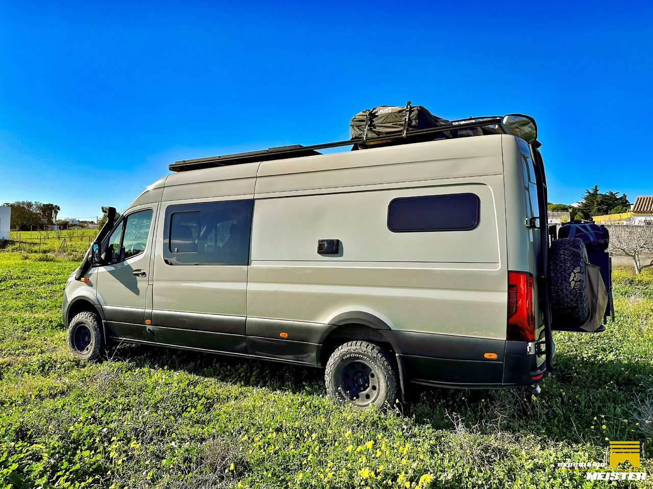 Our concept for this Sprinter is designed for families with 3-4 people who love to stay active and always have their sports equipment with them. Whether it's bicycles, surfboards, kitesurfing gear, skateboards, or other equipment – this van has space for everything! Enjoy sunny days outdoors or stay cozy in the van during rain and cold – day and night! Our Sprinter is perfectly equipped for it. Based on the robust 2021 Mercedes-Benz Sprinter 907 4x4 chassis, we have made numerous custom adjustme...