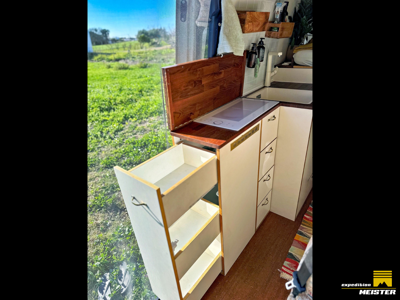 Our concept for this Sprinter is designed for families with 3-4 people who love to stay active and always have their sports equipment with them. Whether it's bicycles, surfboards, kitesurfing gear, skateboards, or other equipment – this van has space for everything!