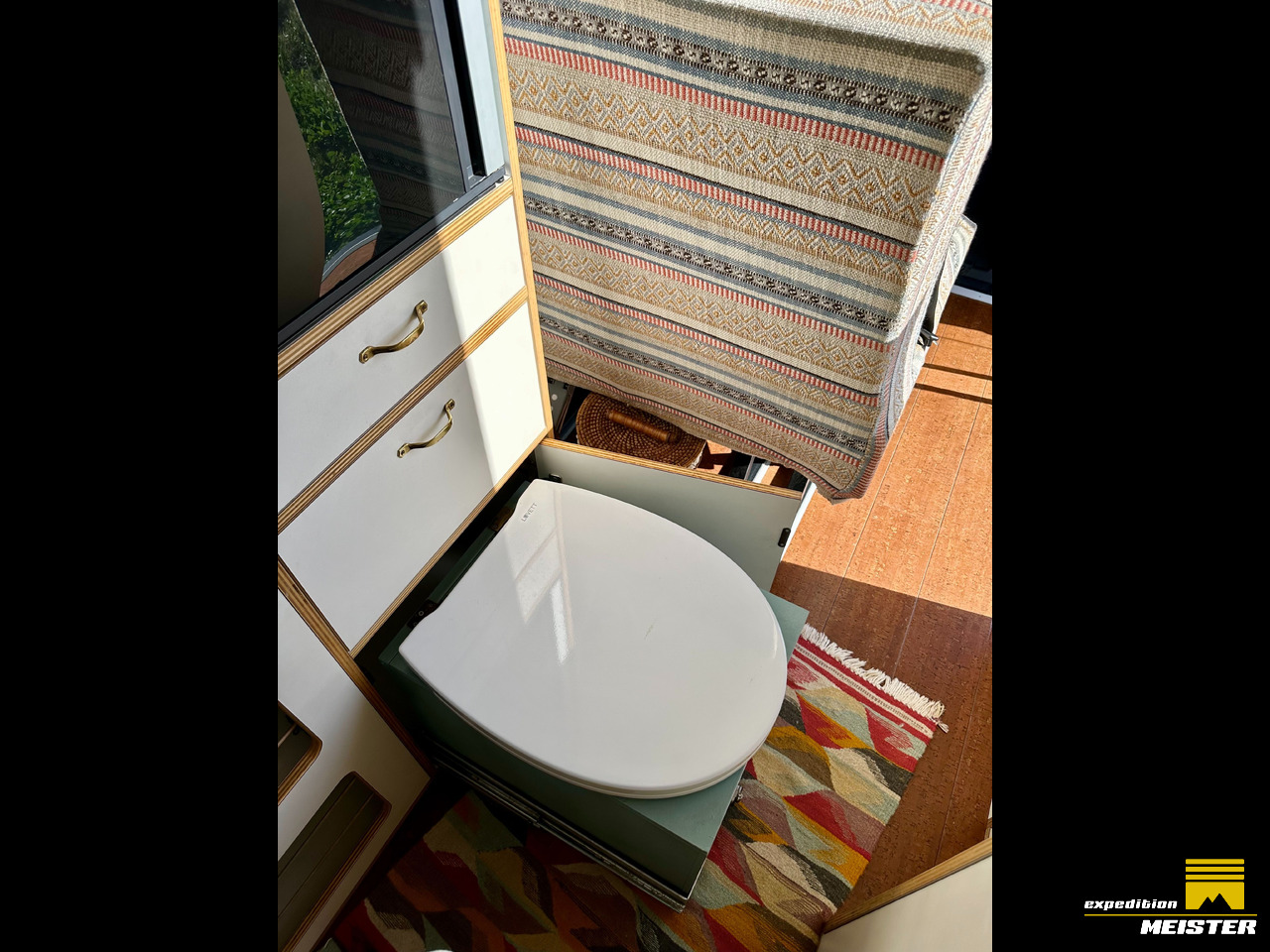 - Custom-fit composting toilet on a heavy-duty hinge, easily stowable