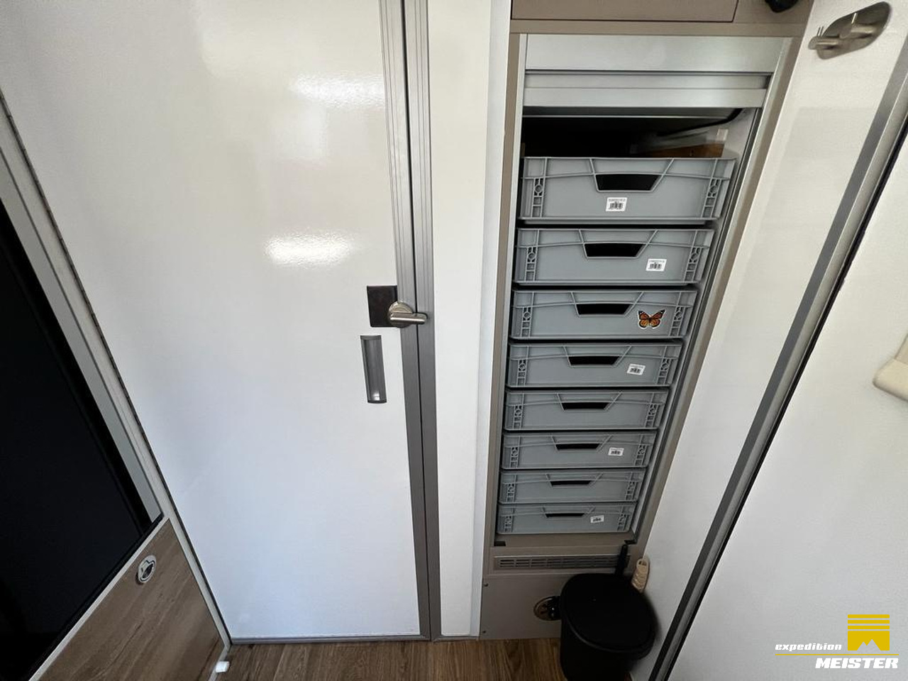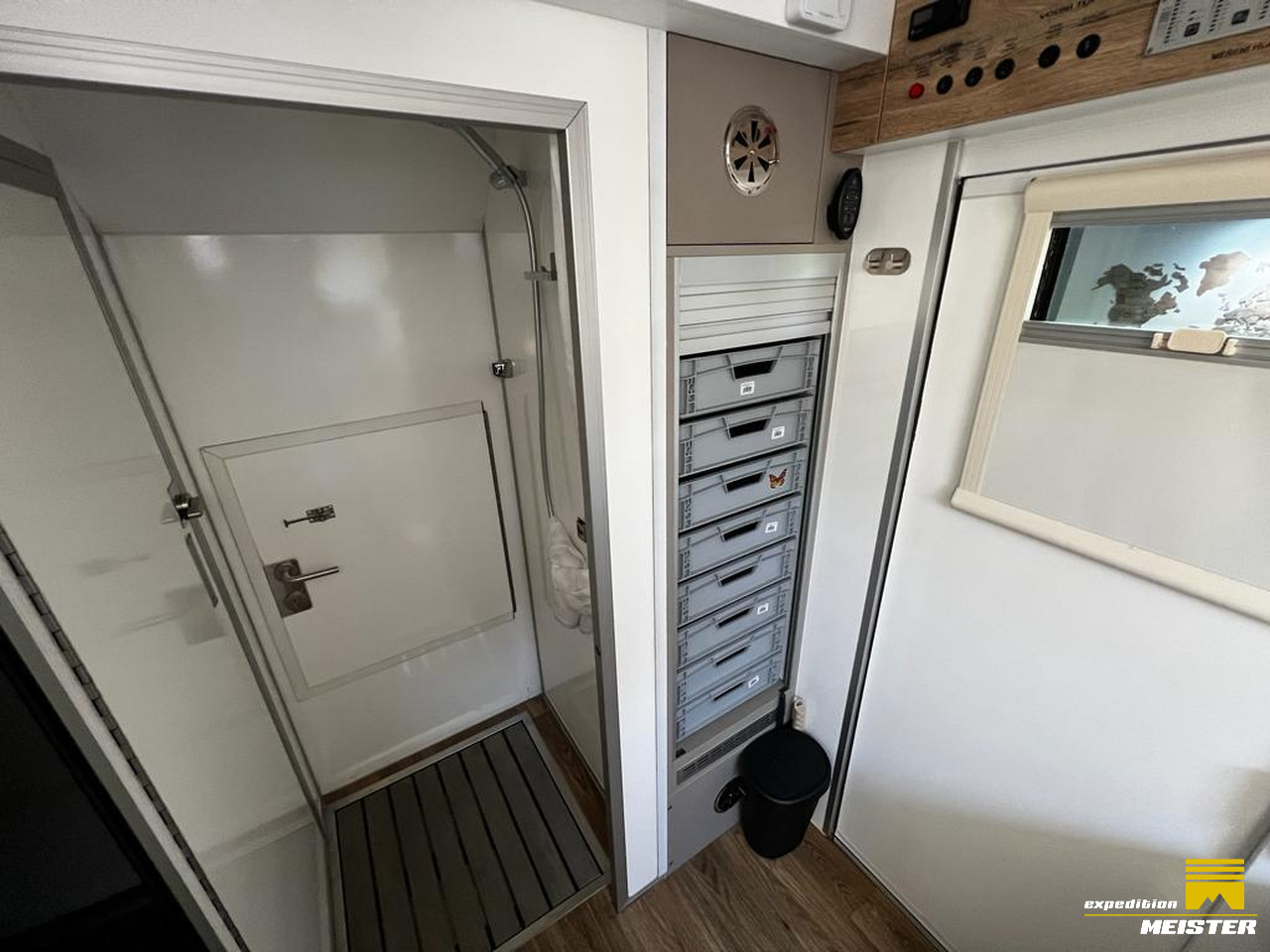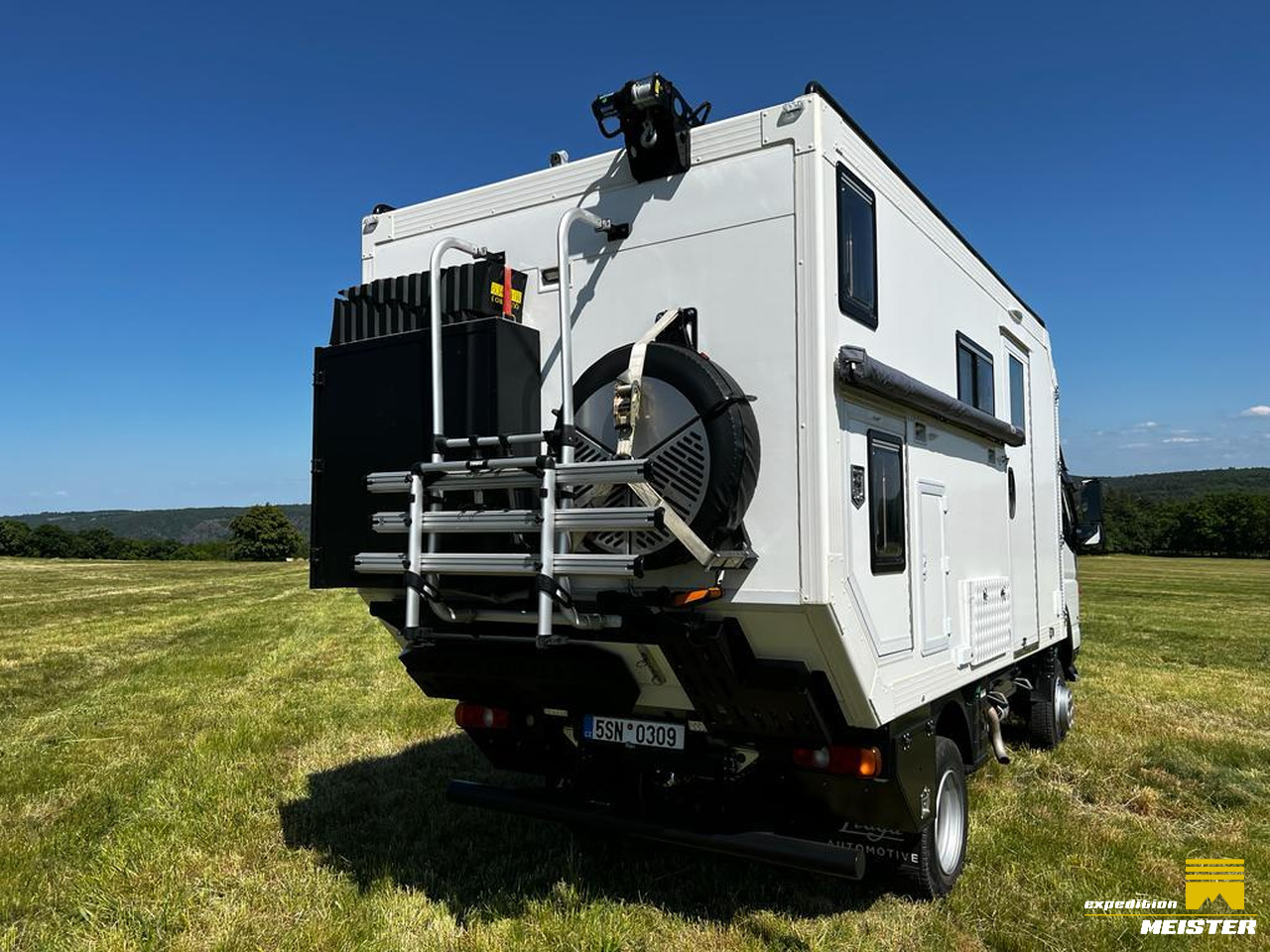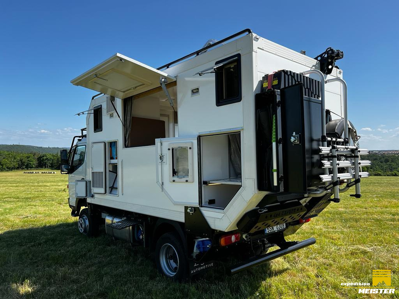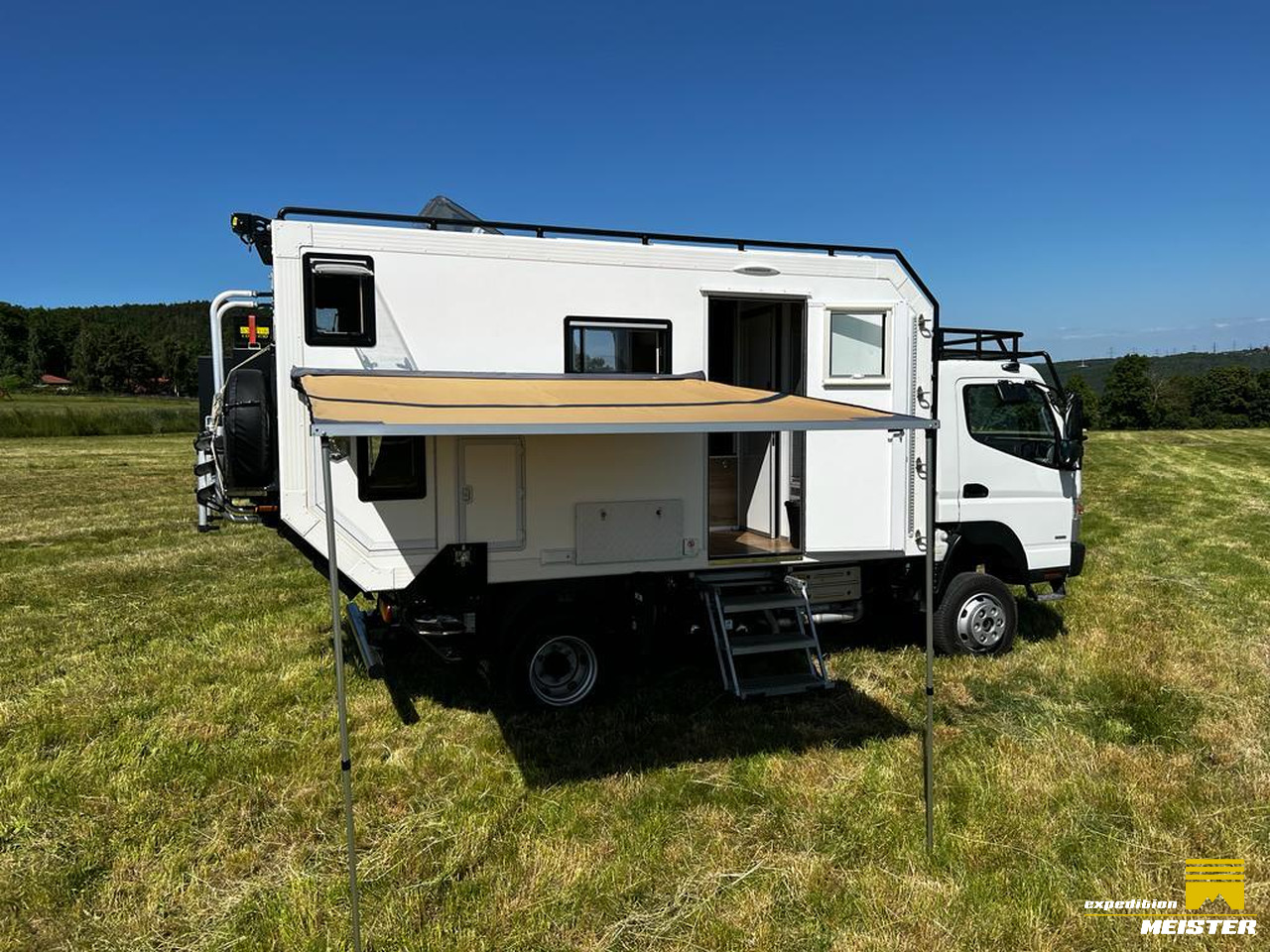 DETAILS Mitsubishi Fuso Canter 4×4, 20 000km, 2021 (2022) • Length 7.22 m • Width 2.20m • Height 3.28m • Curb weight 5870 kg • Perm. Total weight 6500 kg • Wheelbase 3415mm • Engine 129 KW / 175 HP Euro 6 • Tires Continental 205 / 75 R17.5 • 5-speed manual gearbox • 4WD • Differential locks in rear axle (SELF-LOCKING) • Front-rear axle spring suspension • Fuel tank with. 250 liters of diesel • Additional LED headlights 360° • 3 seats in the cab • 2 additional seats in the box body CONSTRUCTION (...