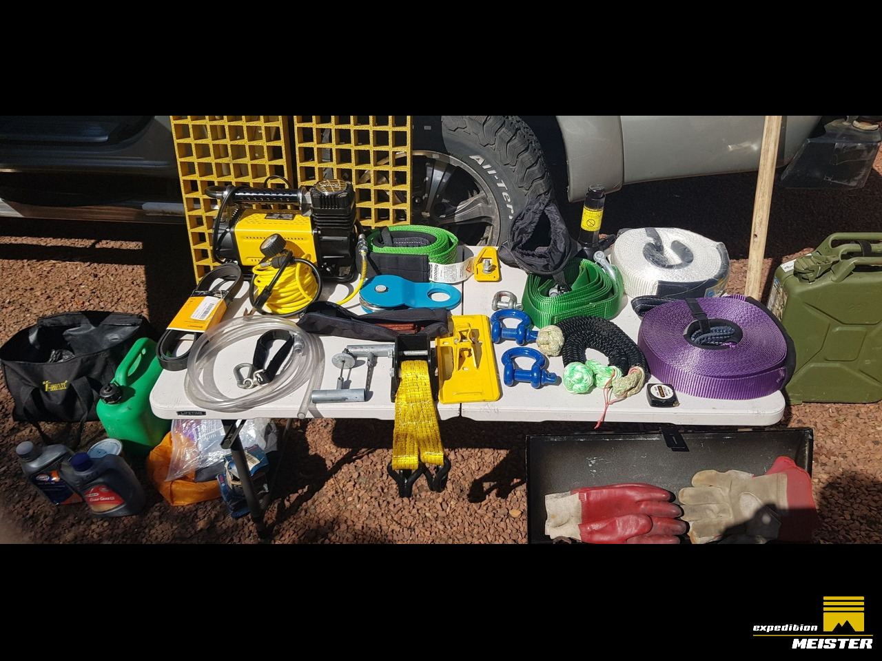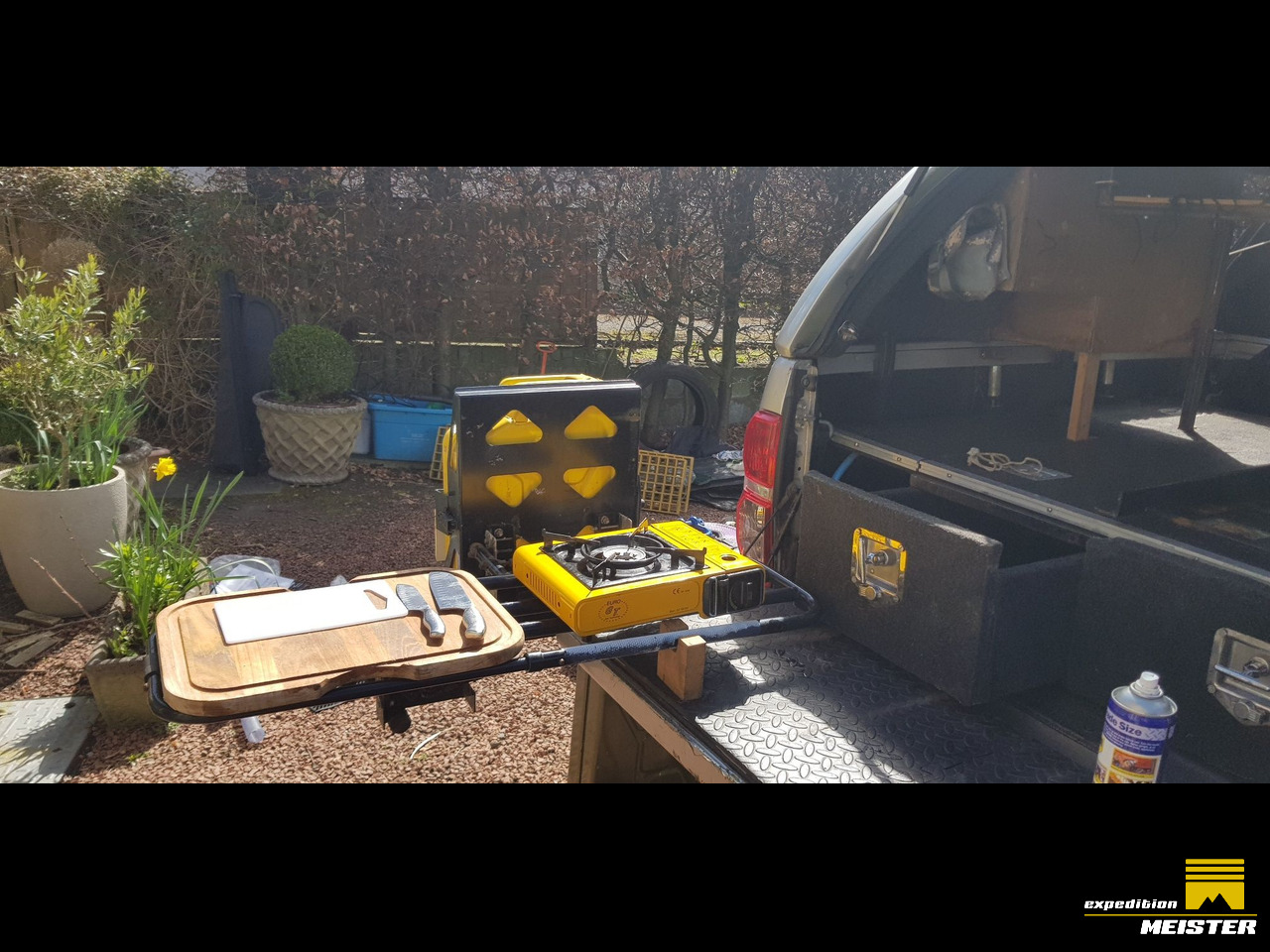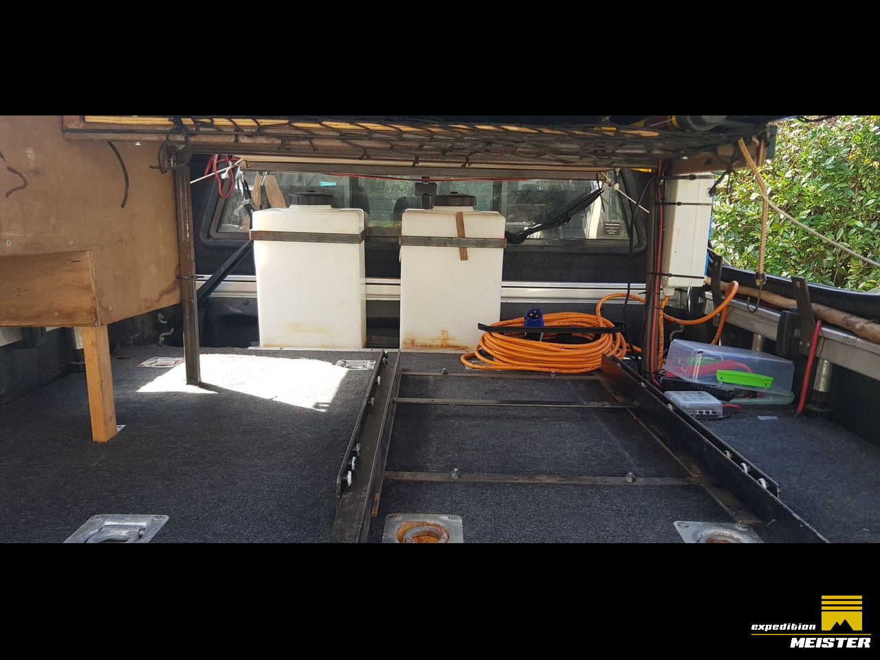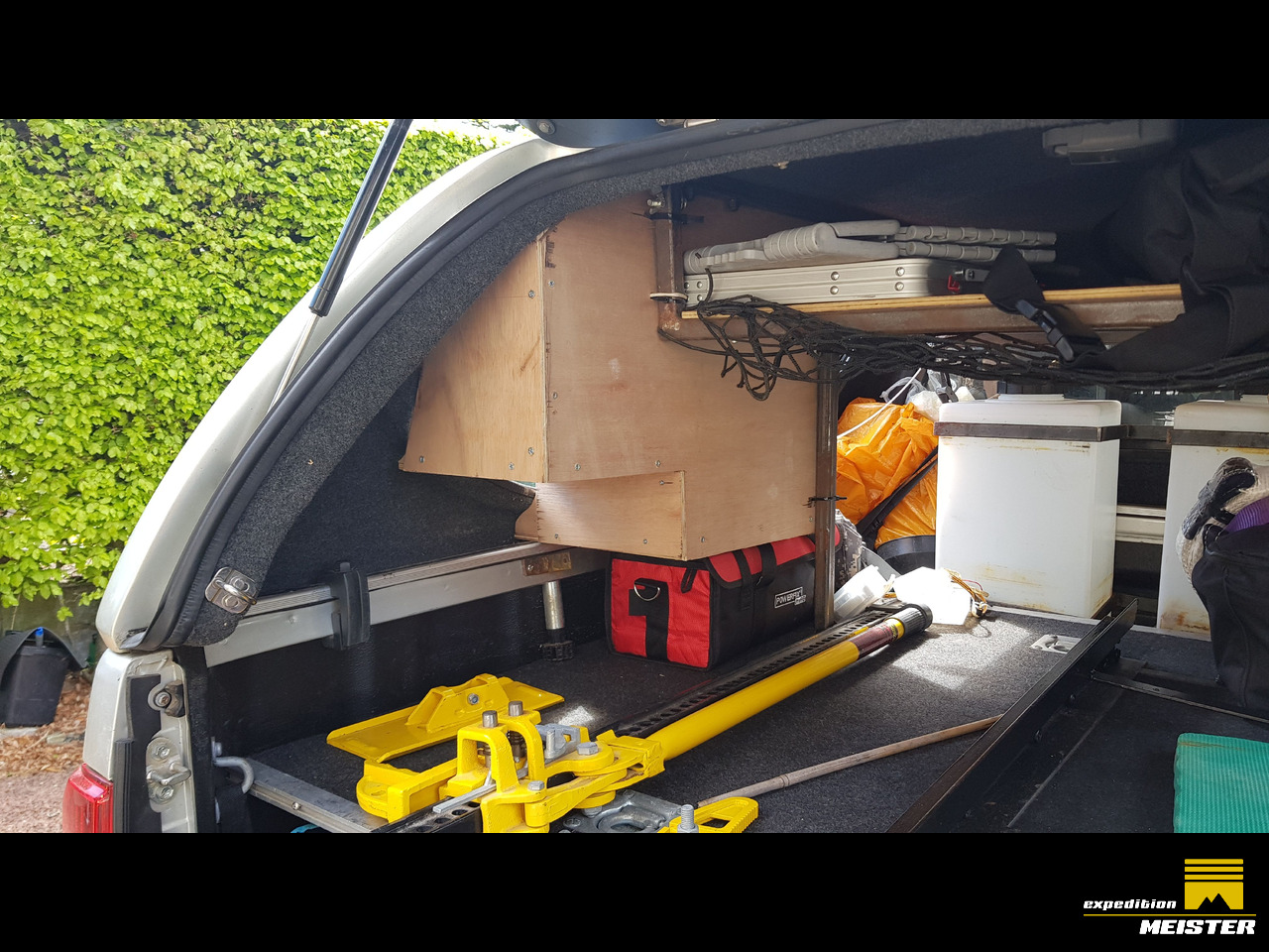 The roof rack and rear canopy has been strengthened and a shelf put in so the chairs are easily accessible and the table fits in next to the recovery tracks on the roof