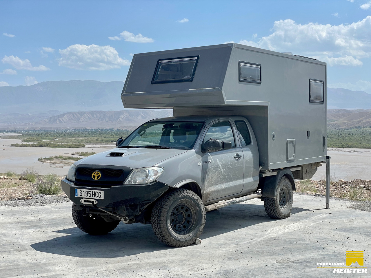 If you need an offroad capable vehicle that offers a lot of comfort, this one is for you. A reliable Toyota Hilux with a custom built cabin that offers hot showers, spacious kitchen and a terrace! The car: Toyota Hilux Extra cab - 2.5 D4D diesel engine with 150HP - Construction year: 2011 - 240.000 kms - 5-speed manual - 4 seats - Registered in Spain as a pick up (so the cabin is considered weight) - Ironman suspension in the front - Air suspension on the rear axle with compressor controlled fro...
